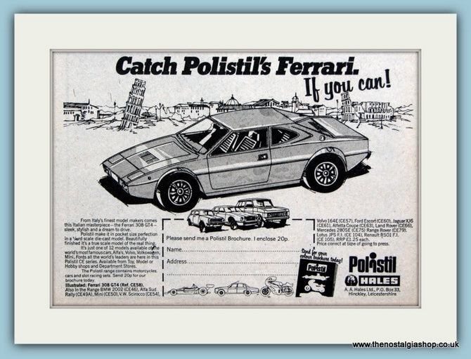 Polistil's Ferrari Model. Catch Polistil's Ferrari if you can..Classic original advert 1978. Presented in cream bevel cut mount with backing card and clear bag. Ready to fit in 10 x 8 inch frame. All our adverts, unless clearly stated are Originals from the date shown They make excellent pieces of wall art and stunning gifts. Many are rare and hard to find and once sold, may not be replaced. Remember you are buying a piece of history. Website watermark is not on original.
