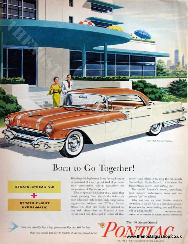 Pontiac Strato-Streak. Born to go together! Classic original advert 1956. This is a large advert - 13.5 x 10.5 inches approx and is sold unmounted Want it framing? If so, buy this then go to Frames Available Catagory. Click to buy on the suitable frame (A3 or larger) and we will mount, frame and post it. All our adverts, unless clearly stated are Originals from the date shown They make excellent pieces of wall art and stunning gifts. Many are rare and hard to find and once sold, may not be replaced. Remember you are buying a piece of history. Website watermarks are not on original.