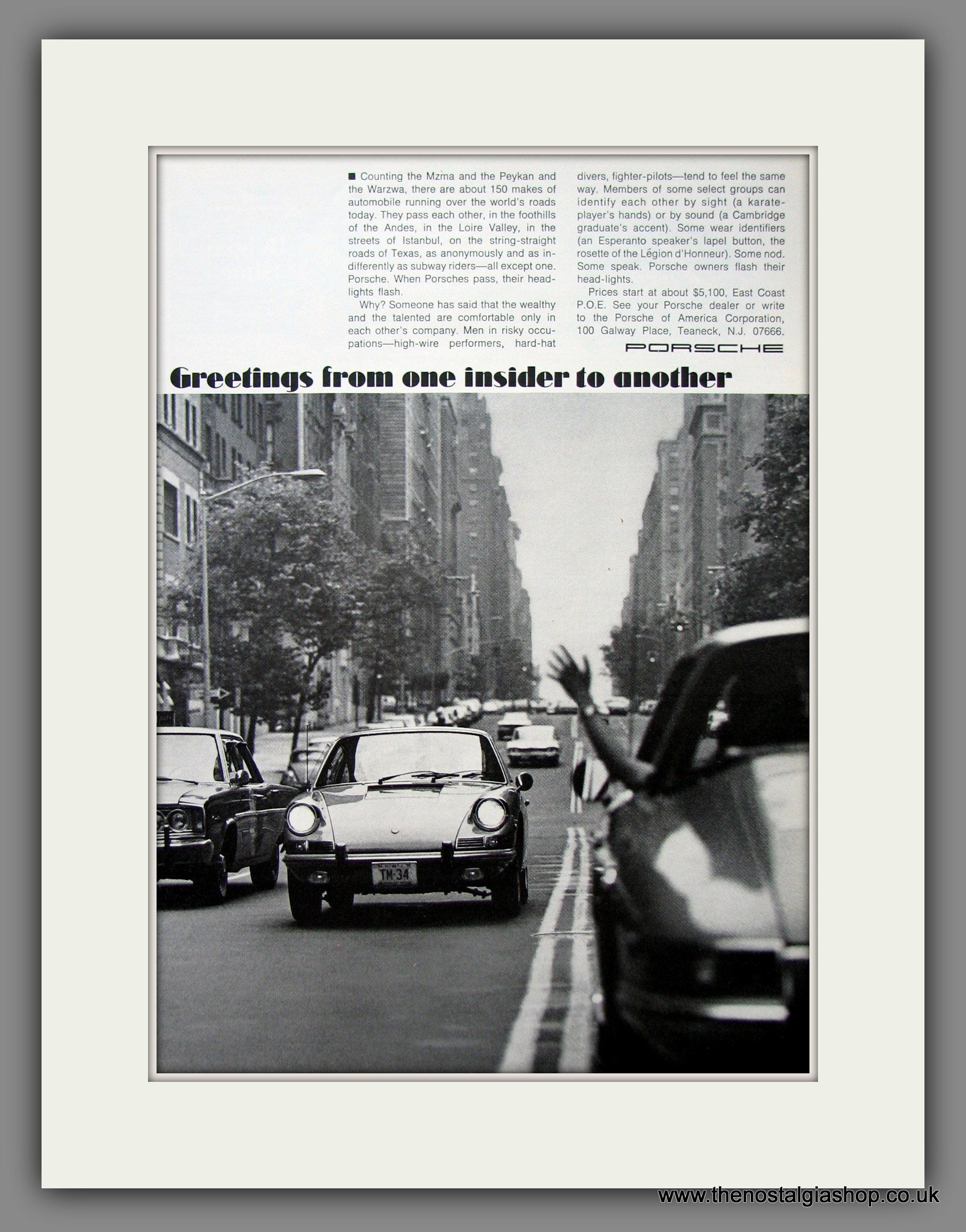 Porsche. Original American Advert 1969. Presented and Supplied in a cream bevel cut mount with backing card and clear bag. Ready to fit in 14 x 11 inch frame. Want it framing? If so, buy this then go to Frames Available Category. Click to buy on the suitable frame and we will do the rest. All our adverts, unless clearly stated are Originals from the date shown They make excellent pieces of wall art and stunning gifts. Many are rare and hard to find and once sold, may not be replaced. Remember you are buying a piece of history. Website watermark is not on original.