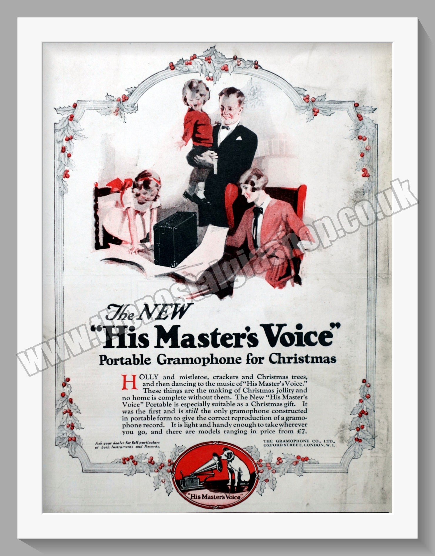 Portable Gramophone His Master's Voice. Vintage Advert. This is a large classic Original advert 1927. Presented and Supplied in a cream bevel cut mount with backing card and clear bag. Ready to fit in 18 x 14 inch frame. The mounted advert will be posted via courier and well packed - protected with a sheet of hardboard to keep it rigid. Any questions or inquiries, please get in touch, we are here to help! All our adverts, unless clearly stated are Originals from the date shown. They make excellent pieces of wall art and stunning gifts. Many are rare and hard to find and once sold, may not be replaced. Remember you are buying a piece of history. Website watermark is not on original .