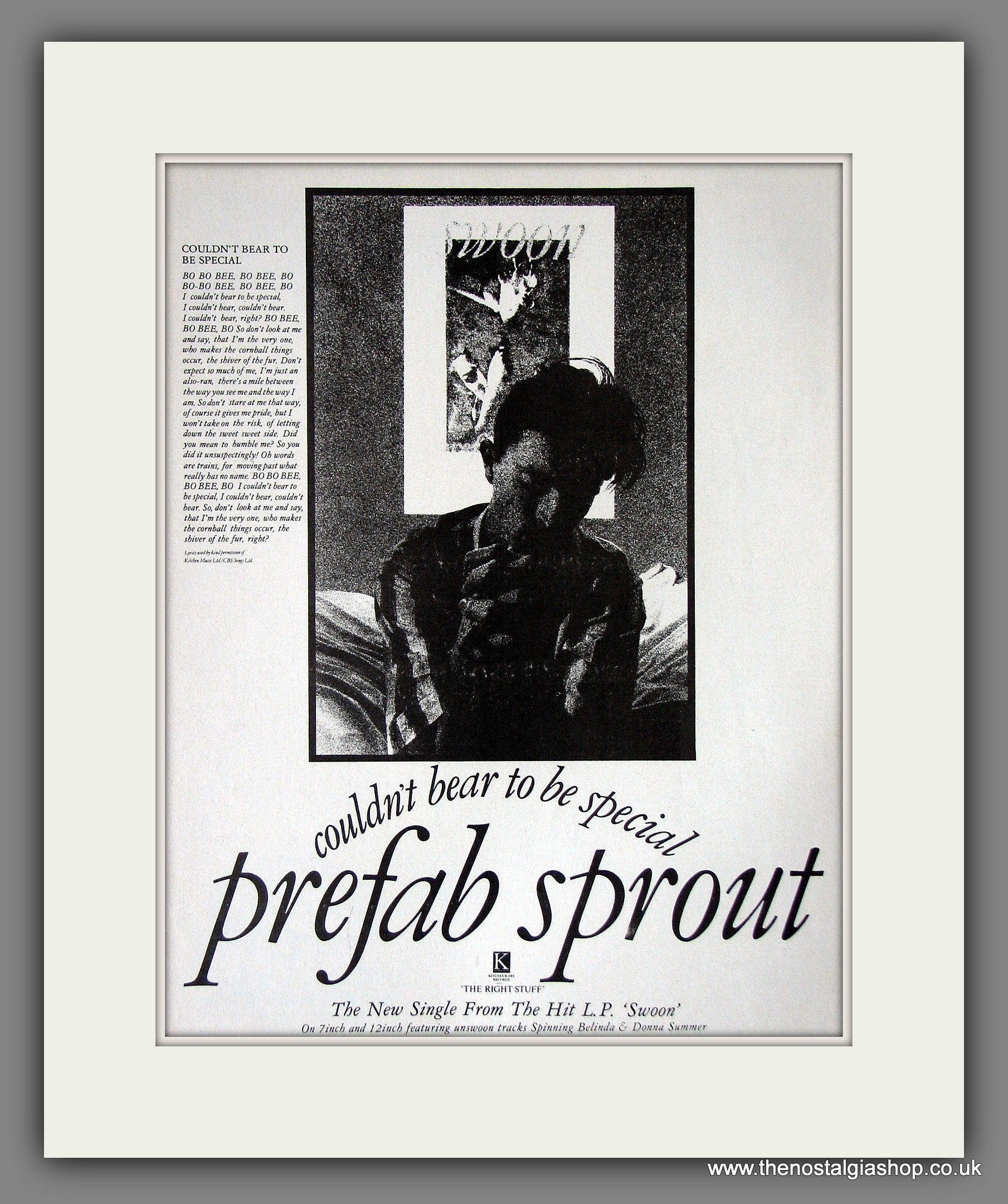 Prefab Sprout. Couldn't Bear To Be Special. Classic Original advert 1984. Presented and Supplied in a cream bevel cut mount with backing card and clear bag. Ready to fit in 14 x 11 inch frame. Want it framing? If so, buy this then go to Frames Available Category. Click to buy on the suitable frame and we will do the rest. All our adverts, unless clearly stated are Originals from the date shown. They make excellent pieces of wall art and stunning gifts. Many are rare and hard to find and once sold, may not be replaced. Remember you are buying a piece of history. Website watermark is not on original.