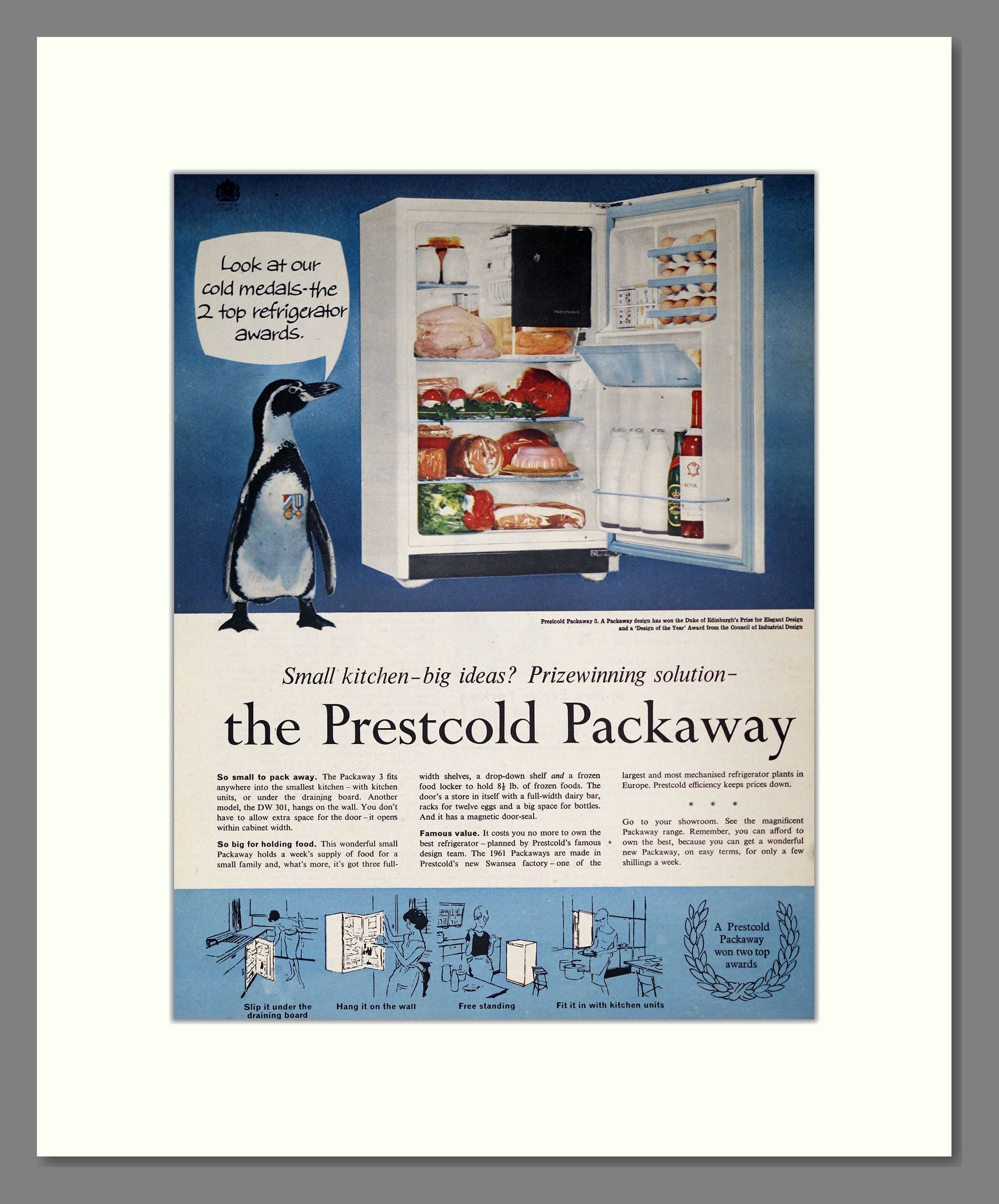 Prestcold - Packaway Refrigerator. Vintage Advert. This is a large classic original advert from 1961. Presented and supplied in a cream bevel cut mount with backing card and clear bag. Ready to fit in a 18 x 14 inches frame. The mounted advert will be posted via courier and well packed - protected with a sheet of hardboard to keep it rigid. Any questions or enquiries, please get in touch, we are here to help! All our adverts, unless clearly stated are originals from the date shown. They make excellent pieces of wall art and stunning gifts. Many are rare and hard to find and once sold, may not be replaced. Remember you are buying a piece of history. Website watermark is not on original.