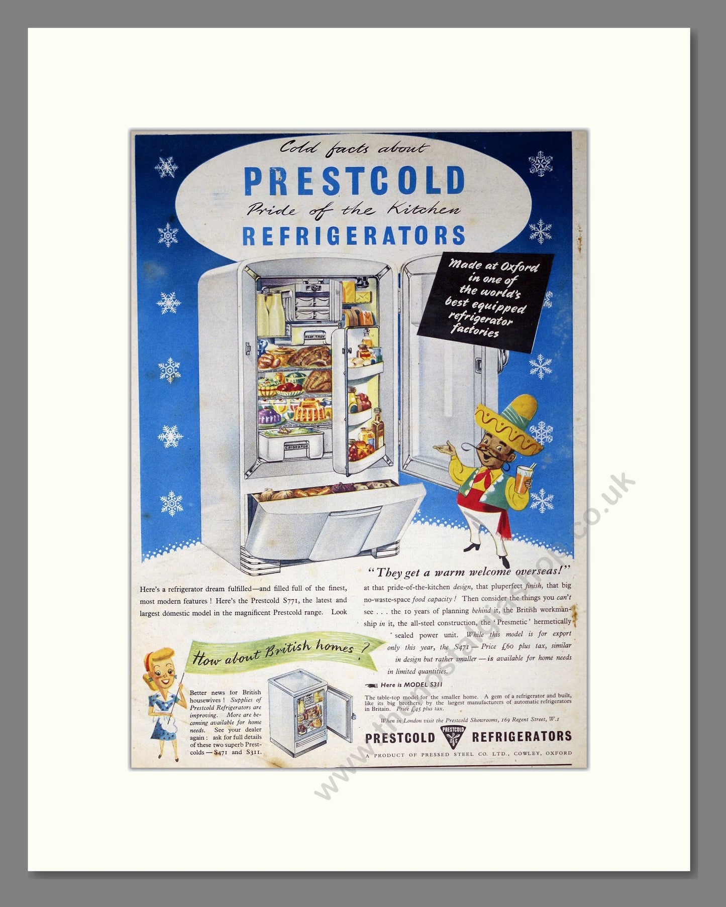 Prestcold - Refrigerator. Vintage Advert. This is a large classic original advert from 1949. Presented and supplied in a cream bevel cut mount with backing card and clear bag. Ready to fit in a 18 x 14 inches frame. The mounted advert will be posted via courier and well packed - protected with a sheet of hardboard to keep it rigid. Any questions or enquiries, please get in touch, we are here to help! All our adverts, unless clearly stated are originals from the date shown. They make excellent pieces of wall art and stunning gifts. Many are rare and hard to find and once sold, may not be replaced. Remember you are buying a piece of history. Website watermark is not on original.