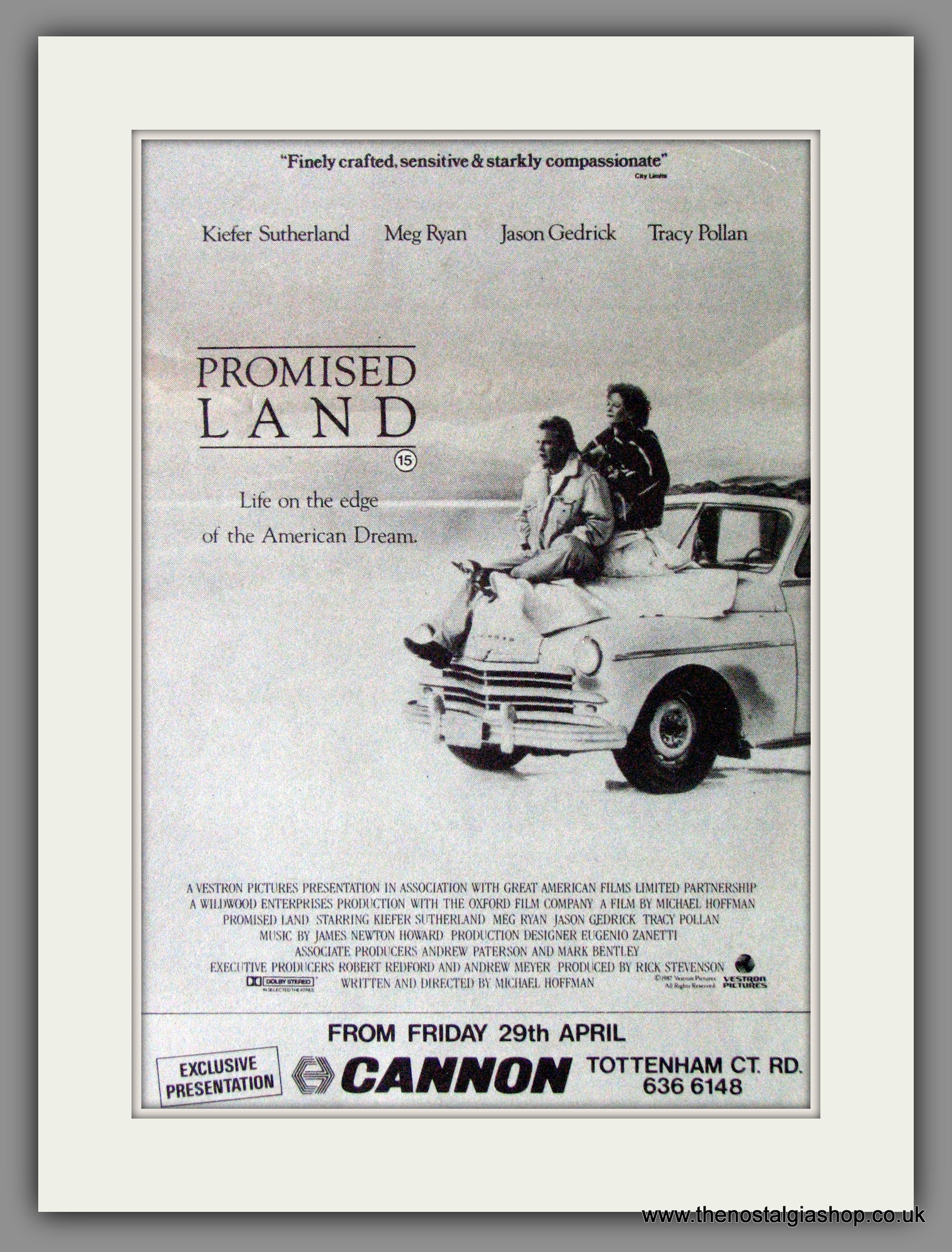 Promised Land, Kiefer Sutherland, Meg Ryan, Tracy Pollan. Classic original advert 1988. Presented and Supplied in cream bevel cut mount with backing card and clear bag. Ready to fit in 14 x 11 inch frame. Want it framing? If so, buy this then go to Frames Available Category. Click to buy on the suitable frame and we will do the rest. All our adverts, unless clearly stated are Originals from the date shown. They make excellent pieces of wall art and stunning gifts. Many are rare and hard to find and once sold, may not be replaced. Remember you are buying a piece of history. Website watermark is not on original.
