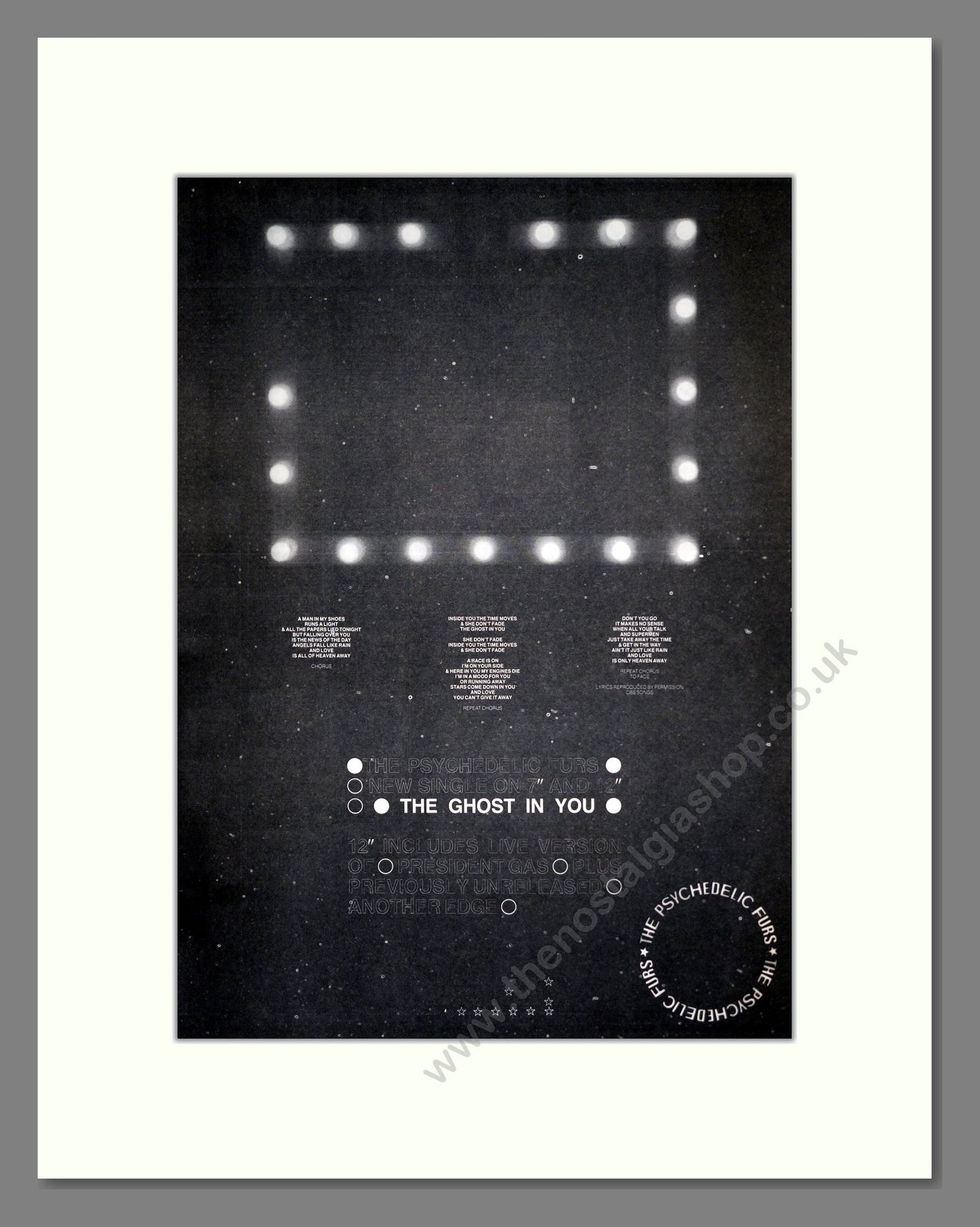 Psychedelic Furs (The) - The Ghost In You. Vintage Advert. This is a large classic original advert from 1984. Presented and supplied in a cream bevel cut mount with backing card and clear bag. Ready to fit in a 20 x 16 inches frame. The mounted advert will be posted via courier and well packed - protected with a sheet of hardboard to keep it rigid. Any questions or enquiries, please get in touch, we are here to help! All our adverts, unless clearly stated are originals from the date shown. They make excellent pieces of wall art and stunning gifts. Many are rare and hard to find and once sold, may not be replaced. Remember you are buying a piece of history. Website watermark is not on original.