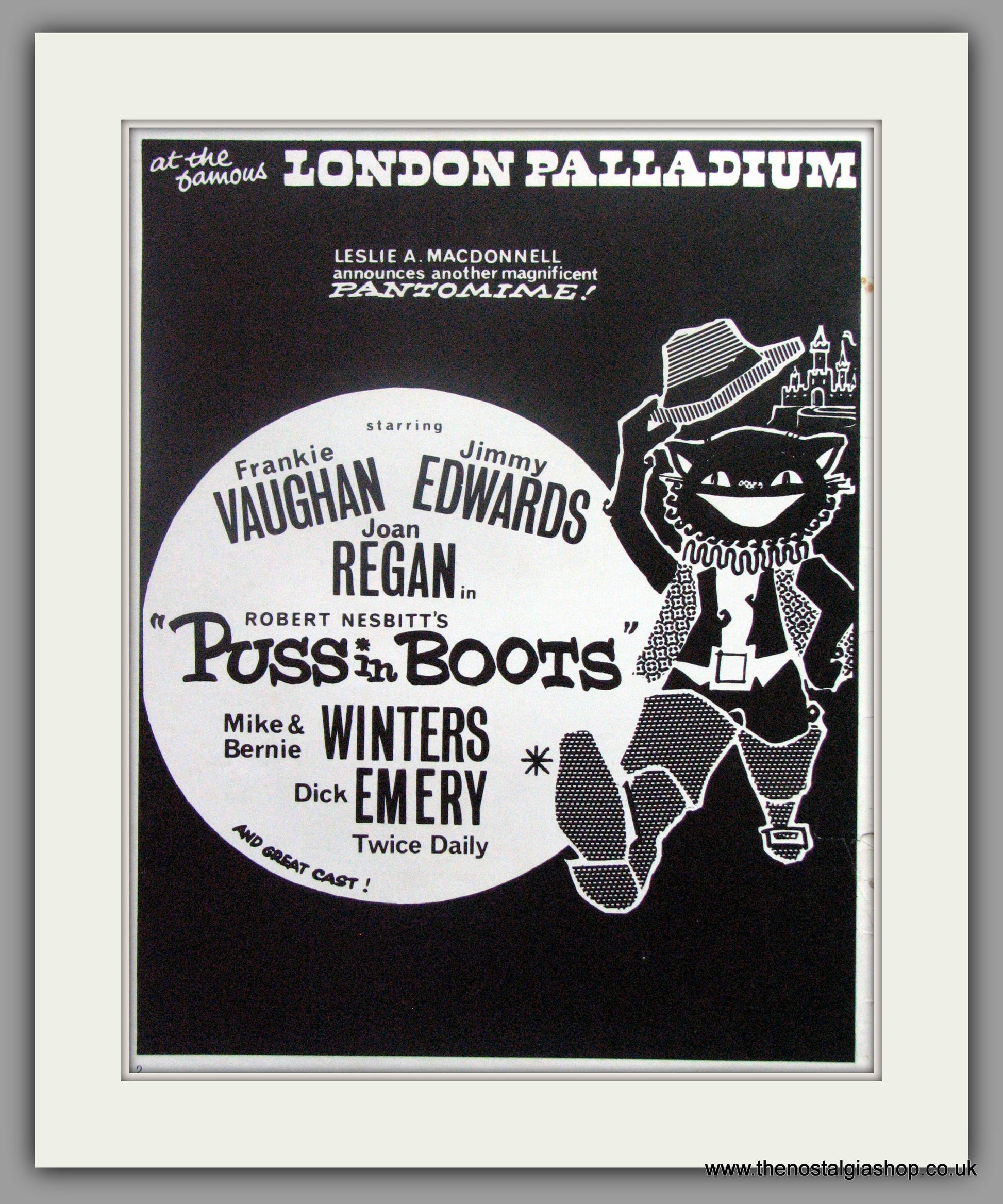 Puss In Boots Pantomime-Frankie Vaughan, Dick Emery, Mike And Bernie Winters, London Palladium. Classic Original advert 1963. Presented in cream bevel cut mount with backing card and clear bag. Ready to fit in 14 x 11 inch frame. Want it framing? If so, buy this then go to Frames Available Category. Click to buy on the suitable frame and we will do the rest. All our adverts, unless clearly stated are Originals from the date shown. They make excellent pieces of wall art and stunning gifts. Many are rare and hard to find and once sold, may not be replaced. Remember you are buying a piece of history. Website watermark is not on original. Slash, Axle Rose.