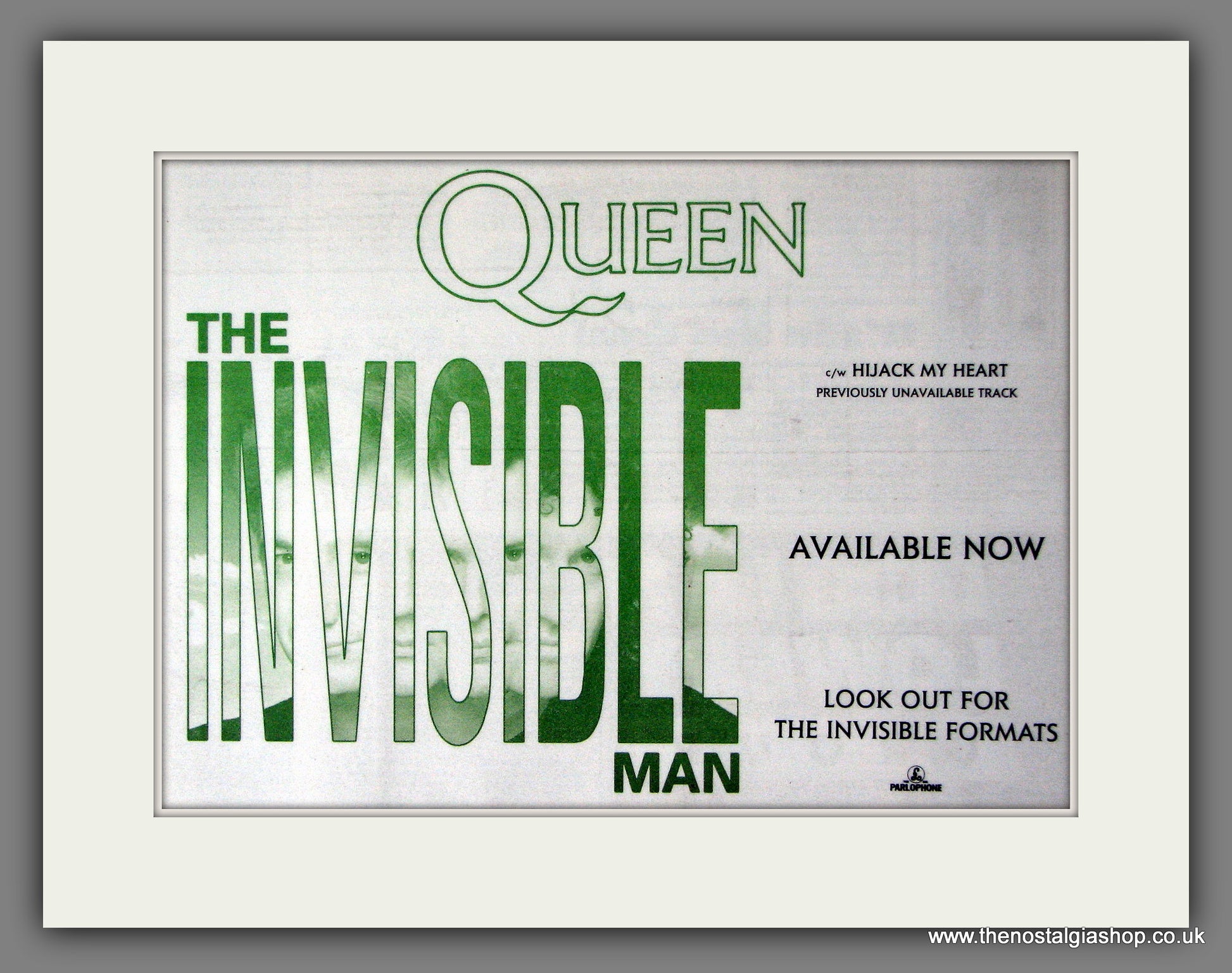 Queen. The Invisible Man. Vintage Advert. Classic original advert 1989. Presented in cream bevel cut mount with backing card and display bag. Ready to fit in 14 x 11 inch frame. Want it framing? If so, buy this then go to Frames Available Category. Click to buy on the suitable frame and we will do the rest. All our adverts, unless clearly stated are Originals from the date shown. They make excellent pieces of wall art and stunning gifts. Many are rare and hard to find and once sold, may not be replaced. Remember you are buying a piece of history. Website watermark is not on original.