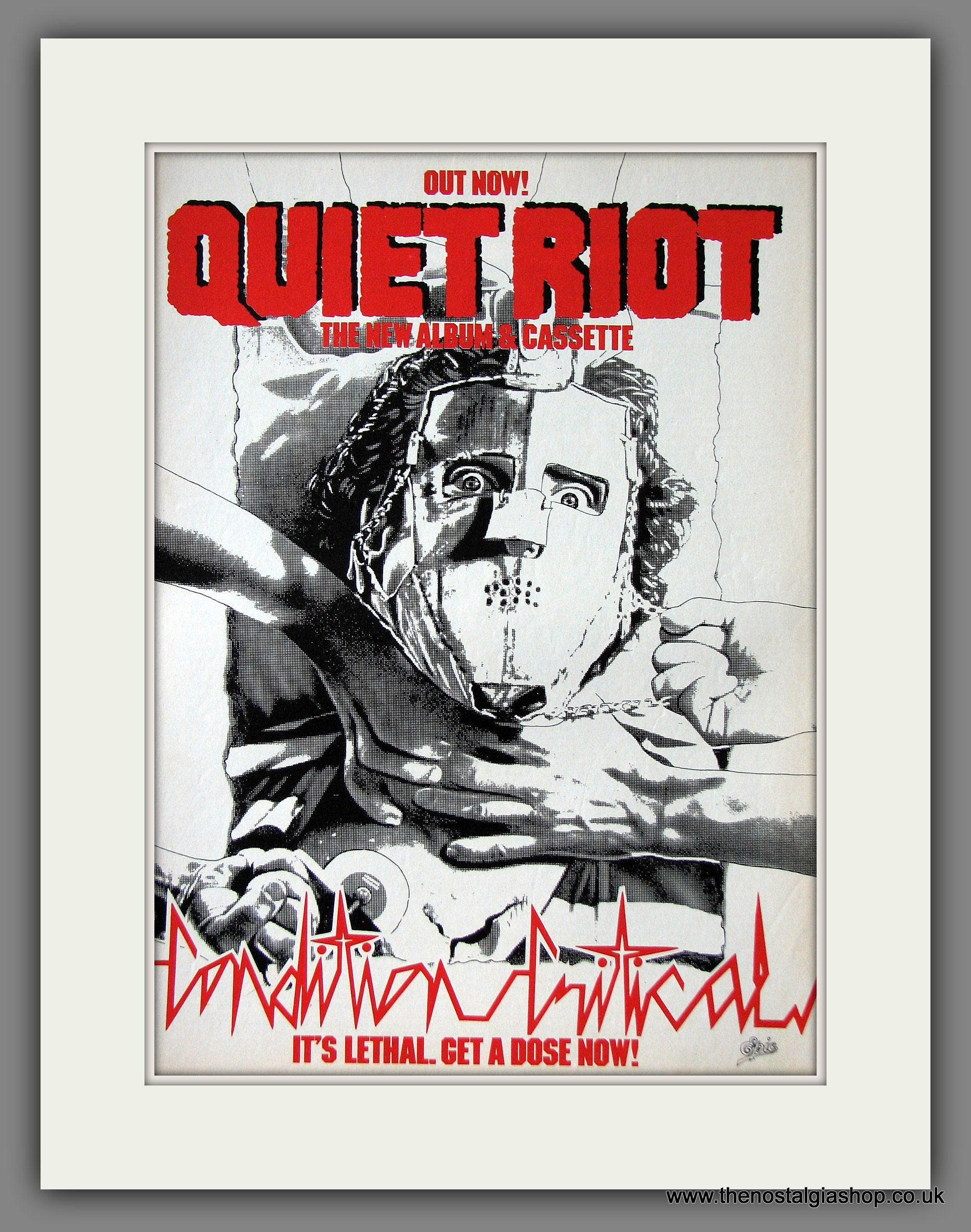 Quiet Riot. Condition Critical. Classic Original advert 1984. Presented and Supplied in a cream bevel cut mount with backing card and clear bag. Ready to fit in 14 x 11 inch frame. All our adverts, unless clearly stated are Originals from the date shown. They make excellent pieces of wall art and stunning gifts. Many are rare and hard to find and once sold, may not be replaced. Remember you are buying a piece of history. Website watermark is not on original.