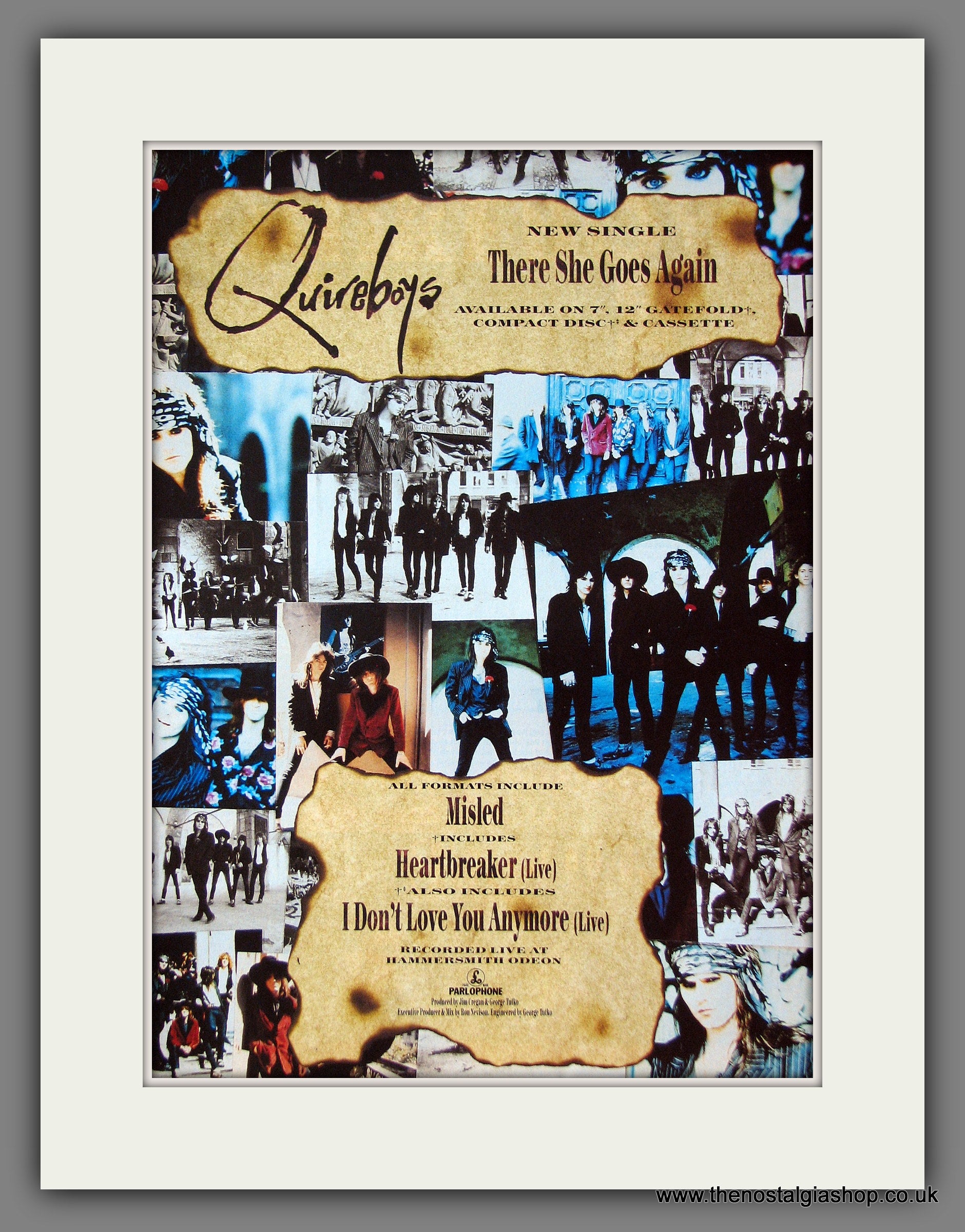 Quireboys. There She Goes Again. Classic Original advert 1990. Presented and Supplied in a cream bevel cut mount with backing card and clear bag. Ready to fit in 14 x 11 inch frame. Want it framing? If so, buy this then go to Frames Available Category. Click to buy on the suitable frame and we will do the rest. All our adverts, unless clearly stated are Originals from the date shown. They make excellent pieces of wall art and stunning gifts. Many are rare and hard to find and once sold, may not be replaced. Remember you are buying a piece of history. Website watermark is not on original.