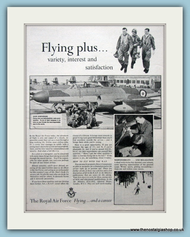 R.A.F. Future perfect... Flying plus.... Classic original adverts 1955 (price is for both adverts). Presented in cream bevel cut mount with backing card and clear bag. Each is ready to fit in 14 x 11 inch frames. Want them framing? If so, buy this then go to Frames Available Category. Click to buy on the suitable frame and we will do the rest. All our adverts, unless clearly stated are Originals from the date shown They make excellent pieces of wall art and stunning gifts. Many are rare and hard to find and once sold, may not be replaced. Remember you are buying a piece of history. Website watermark is not on original.