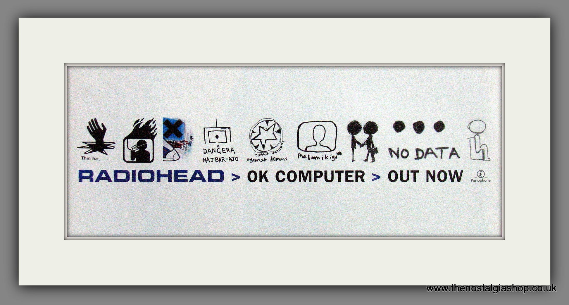 Radiohead, Ok Computer. Classic Original advert 1997. Presented and Supplied in a cream bevel cut mount with backing card and clear bag. Ready to fit in 14.5 x 7 inch frame. Want it framing? If so, buy this then go to Frames Available Category. Click to buy on the suitable frame and we will do the rest. All our adverts, unless clearly stated are Originals from the date shown. They make excellent pieces of wall art and stunning gifts. Many are rare and hard to find and once sold, may not be replaced. Remember you are buying a piece of history. Website watermark is not on original.