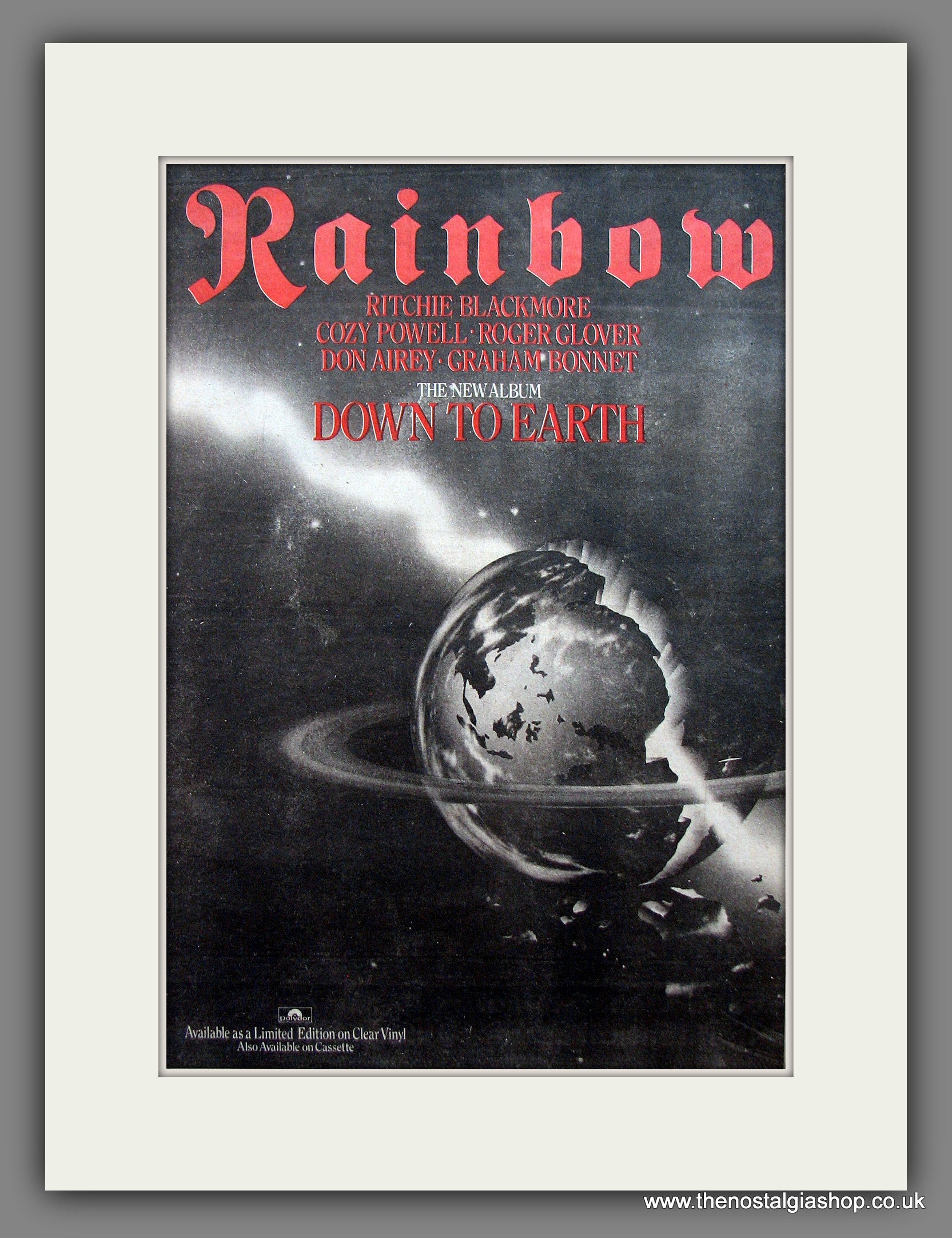 Rainbow Down To Earth. Vintage Advert. This is a large classic Original advert 1979. Presented and Supplied in a cream bevel cut mount with backing card and clear bag. Ready to fit in 20 x 16 inch frame. The mounted advert will be posted via courier and well packed - protected with a sheet of hardboard to keep it rigid. Any questions or inquiries, please get in touch, we are here to help! All our adverts, unless clearly stated are Originals from the date shown. They make excellent pieces of wall art and stunning gifts. Many are rare and hard to find and once sold, may not be replaced. Remember you are buying a piece of history. Website watermark is not on original. Richie Blackmore.