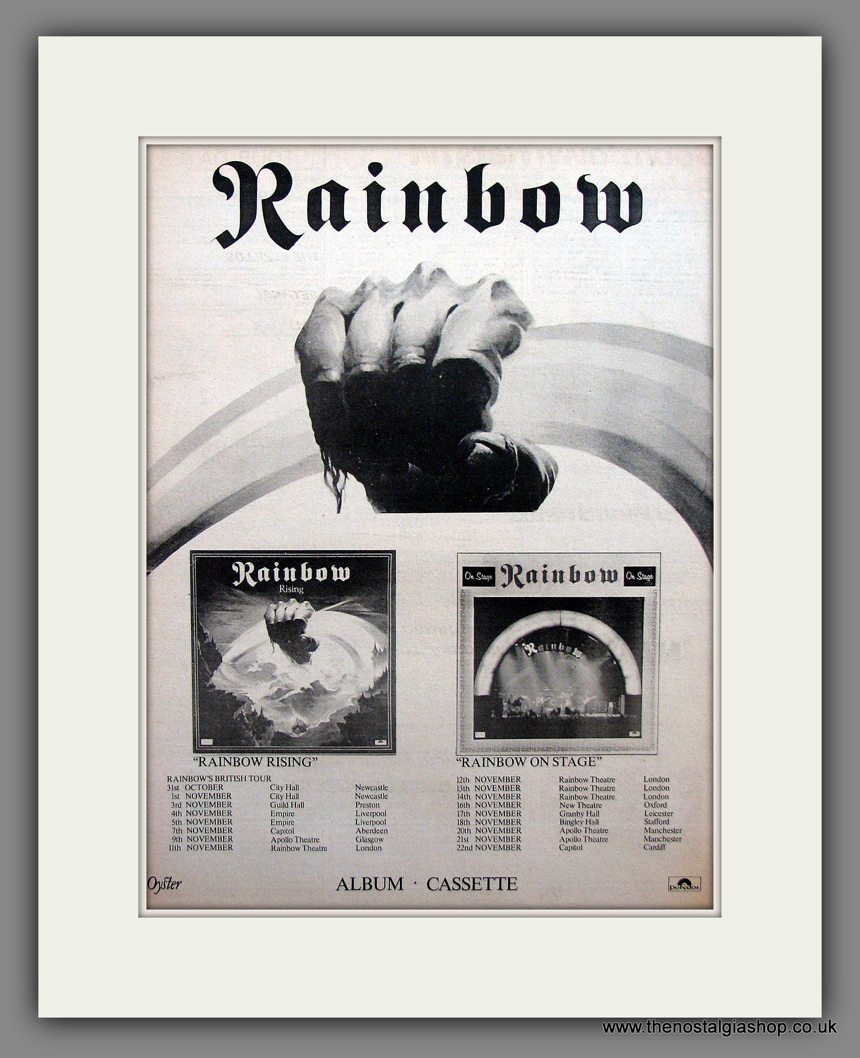 Rainbow Rising. Vintage Advert. This is a large classic Original advert 1977. Presented and Supplied in a cream bevel cut mount with backing card and clear bag. Ready to fit in 20 x 16 inch frame. The mounted advert will be posted via courier and well packed - protected with a sheet of hardboard to keep it rigid. Any questions or inquiries, please get in touch, we are here to help! All our adverts, unless clearly stated are Originals from the date shown. They make excellent pieces of wall art and stunning gifts. Many are rare and hard to find and once sold, may not be replaced. Remember you are buying a piece of history. Website watermark is not on original. Richie Blackmore.