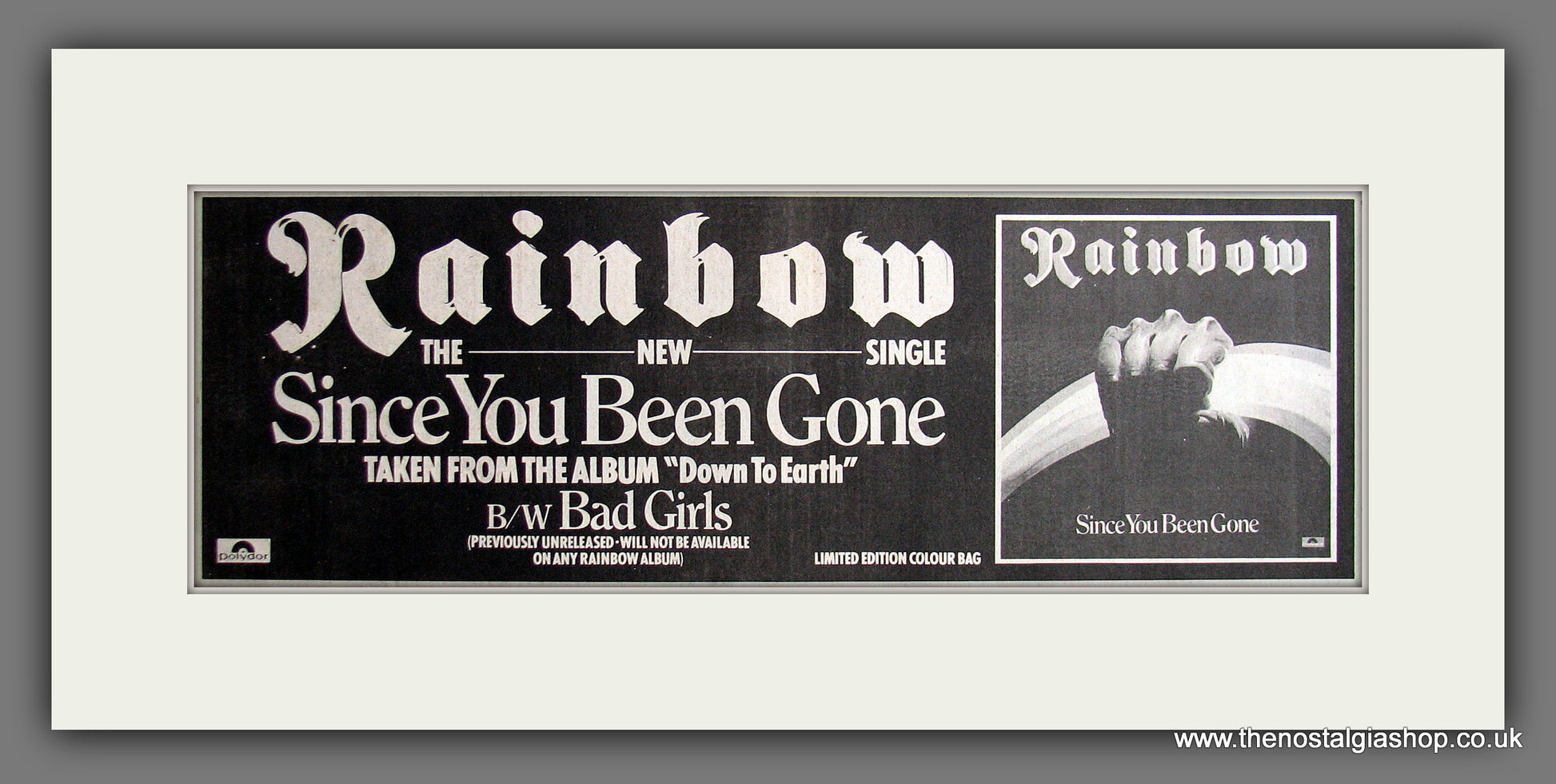 Rainbow. Since You Been Gone. This is a large Original Vintage Advert 1979. Presented and Supplied in a cream, bevel cut mount with backing card and clear bag. Ready to fit in 20 x 10 inch frame. The mounted advert will be posted via courier and well packed - protected with a sheet of hardboard to keep it rigid. Any questions or inquiries, please get in touch, we are here to help! All our adverts, unless clearly stated are Originals from the date shown. They make excellent pieces of wall art and stunning gifts. Many are rare and hard to find and once sold, may not be replaced. Remember you are buying a piece of history. Website watermark is not on original.