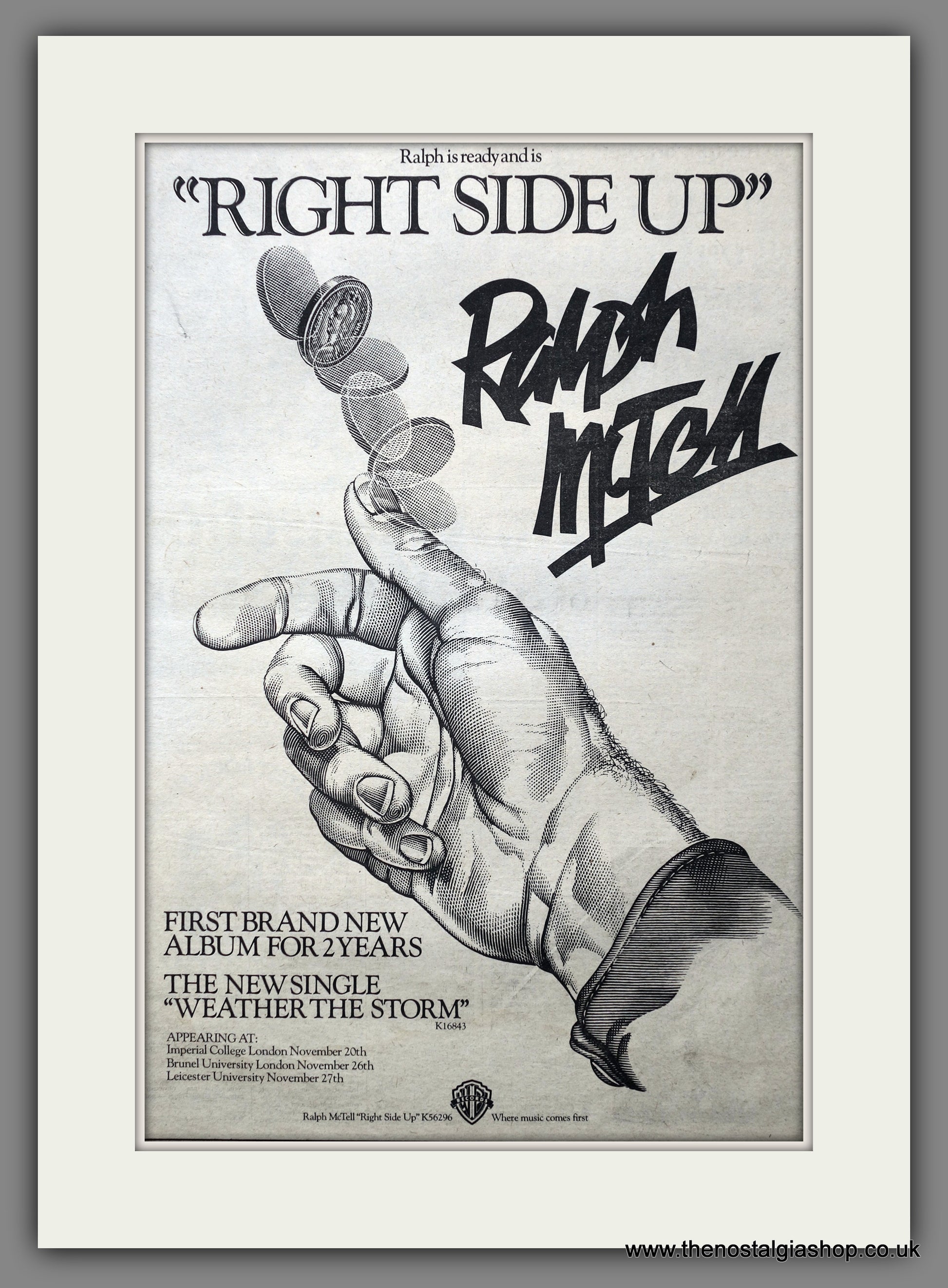 Ralph McTell Right Side Up. This is a large classic Original Vintage Advert 1976. Presented and Supplied in a cream, bevel cut mount with backing card and clear bag. Ready to fit in 20 x 16 inch frame. The mounted advert will be posted via courier and well packed - protected with a sheet of hardboard to keep it rigid. Any questions or inquiries, please get in touch, we are here to help! All our adverts, unless clearly stated are Originals from the date shown. They make excellent pieces of wall art and stunning gifts. Many are rare and hard to find and once sold, may not be replaced. Remember you are buying a piece of history. Website watermark is not on original.
