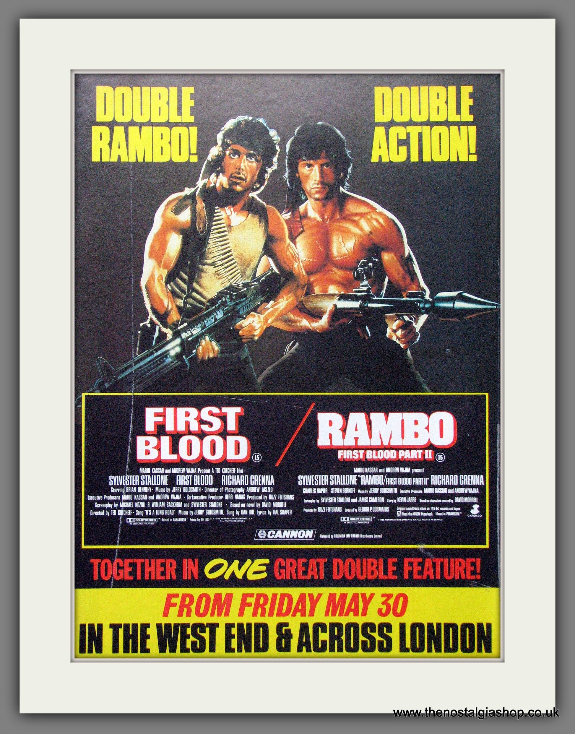 Rambo I and II, Sylvester Stallone. Original advert 1986. Presented and Supplied in a cream bevel cut mount with backing card and Clear Bag. Ready to fit in 14 x 11 inch frame. Want it framing? If so, buy this then go to Frames Available Category. Click to buy on the suitable frame and we will do the rest. All our adverts, unless clearly stated are Originals from the date shown. They make excellent pieces of wall art and stunning gifts. Many are rare and hard to find and once sold, may not be replaced. Remember you are buying a piece of history. Note, light crease down left side of advert.
