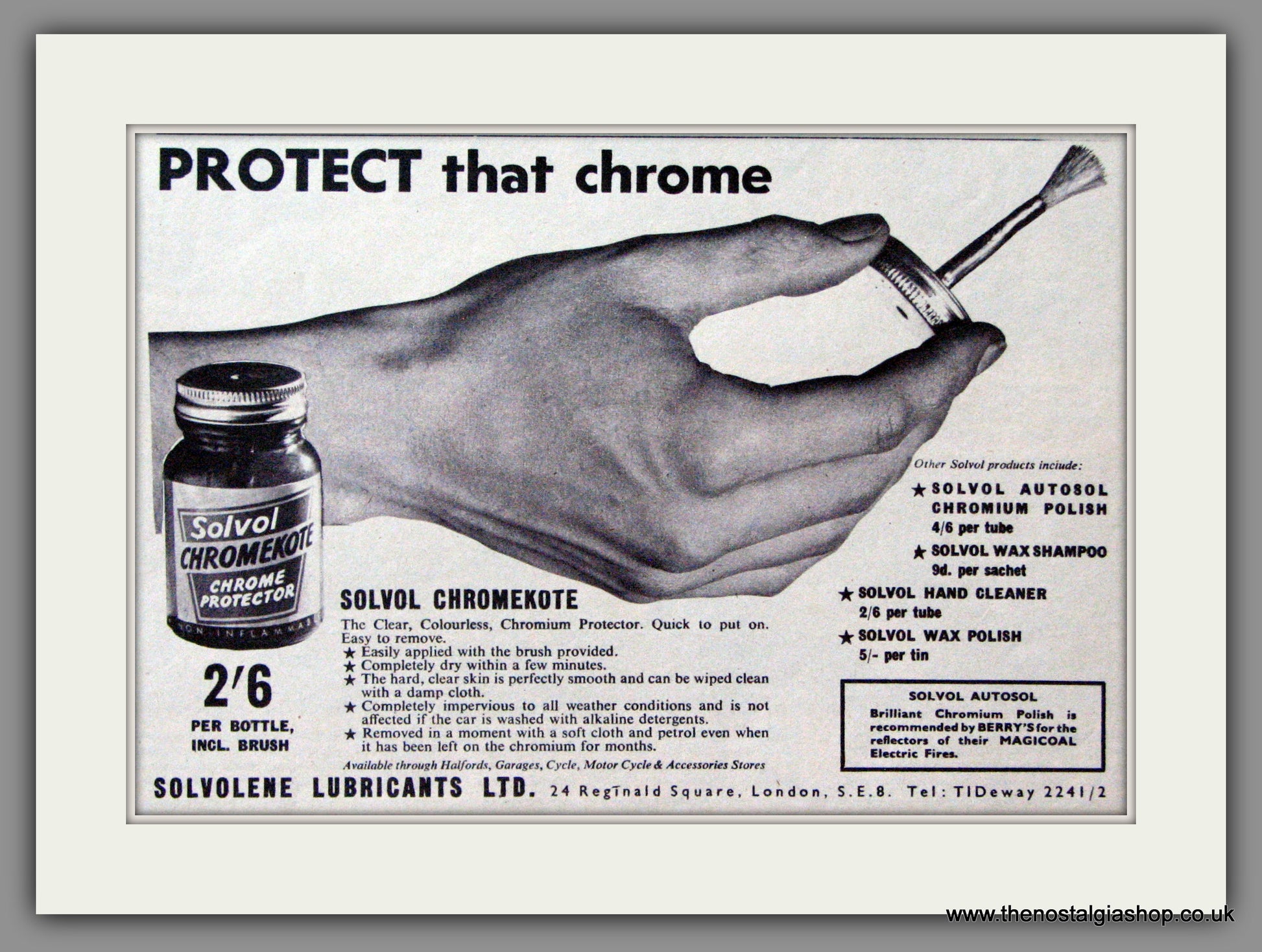 Solvol Chromekote, Protect That Chrome!! Scooter Accessories. Vintage Original Advert from 1963. Presented and Supplied in cream bevel cut mount with backing board and clear bag. Made to fit straight into 12 by 10 inch frame. All our Adverts, unless clearly stated are Original and from the year stated. They are NOT modern reprints. Many are difficult to get hold of , some are very rare and once sold may not be replaced, Remember, you are buying a piece of historic nostalgia. Lots more adverts available. Please contact us if you don't see the advert you want. Scooters. Mods.