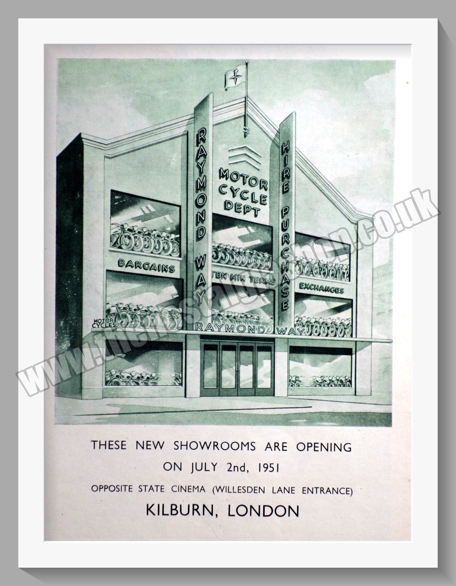 Raymond Way Motorcycles. Kilburn, London. Classic Original Advert 1951. Presented and Supplied in a 14 x 11 Inch, cream bevel cut mount with backing card and clear bag. Ready to frame. All our adverts, unless clearly stated are Originals from the date shown They make excellent pieces of wall art and stunning gifts. Many are rare and hard to find and once sold, may not be replaced. Remember you are buying a piece of history. Website watermark is not on original. Vintage Motorcycle Dealerships.