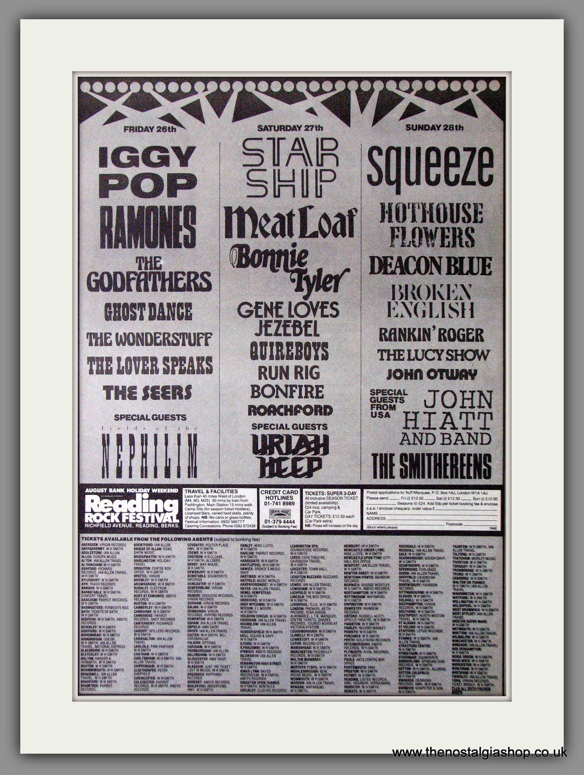 Reading Festival '88 Rock Festival. Vintage Advert 1988 (ref AD11399). Presented and supplied in a cream bevel cut mount with backing card and clear bag. Ready to fit in a 20x16 inch frame. The mounted advert will be posted via courier and well packed - protected with a sheet of hardboard to keep it rigid. Any questions or enquiries, please get in touch, we are here to help! All our adverts, unless clearly stated are originals from the date shown. They make excellent pieces of wall art and stunning gifts. Many are rare and hard to find and once sold, may not be replaced. Remember you are buying a piece of history. Website watermark is not on original.