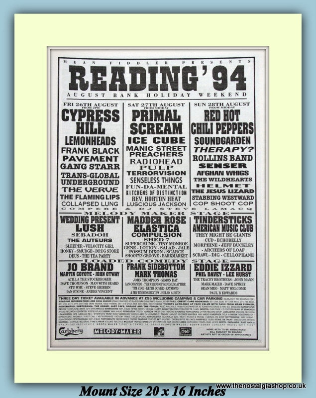 Reading Festival 1994. Reading 94. August bank holiday weekend, 26th to 28th Aug, Featuring; headliners - Cypress Hill, Primal Scream, Red Hot Chili Peppers. This is a large classic Original Festival advert 1994. Presented in cream bevel cut mount with backing card and clear bag. Ready to fit in 20 x 16 inch frame. The mounted advert will be posted via courier and well packed - protected with a sheet of hardboard to keep it rigid. Any questions or inquiries, please get in touch, we are here to help! All our adverts, unless clearly stated are Originals from the date shown. They make excellent pieces of wall art and stunning gifts. Many are rare and hard to find and once sold, may not be replaced. Remember you are buying a piece of history. Website watermark is not on original.