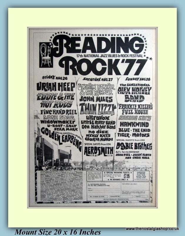 Reading Rock 1977. Uriah Heep, Thin Lizzy, Hawkwind, Eddie and the Hot rods. This is a large classic Original advert 1977. Presented in cream bevel cut mount with backing card and clear bag. Ready to fit in 20 x 16 inch frame. The mounted advert will be posted via courier and well packed - protected with a sheet of hardboard to keep it rigid. Any questions or inquiries, please get in touch, we are here to help! All our adverts, unless clearly stated are Originals from the date shown. They make excellent pieces of wall art and stunning gifts. Many are rare and hard to find and once sold, may not be replaced. Remember you are buying a piece of history. Website watermark is not on original. NOTE slight browning across centre of this advert - not visible on the photo.