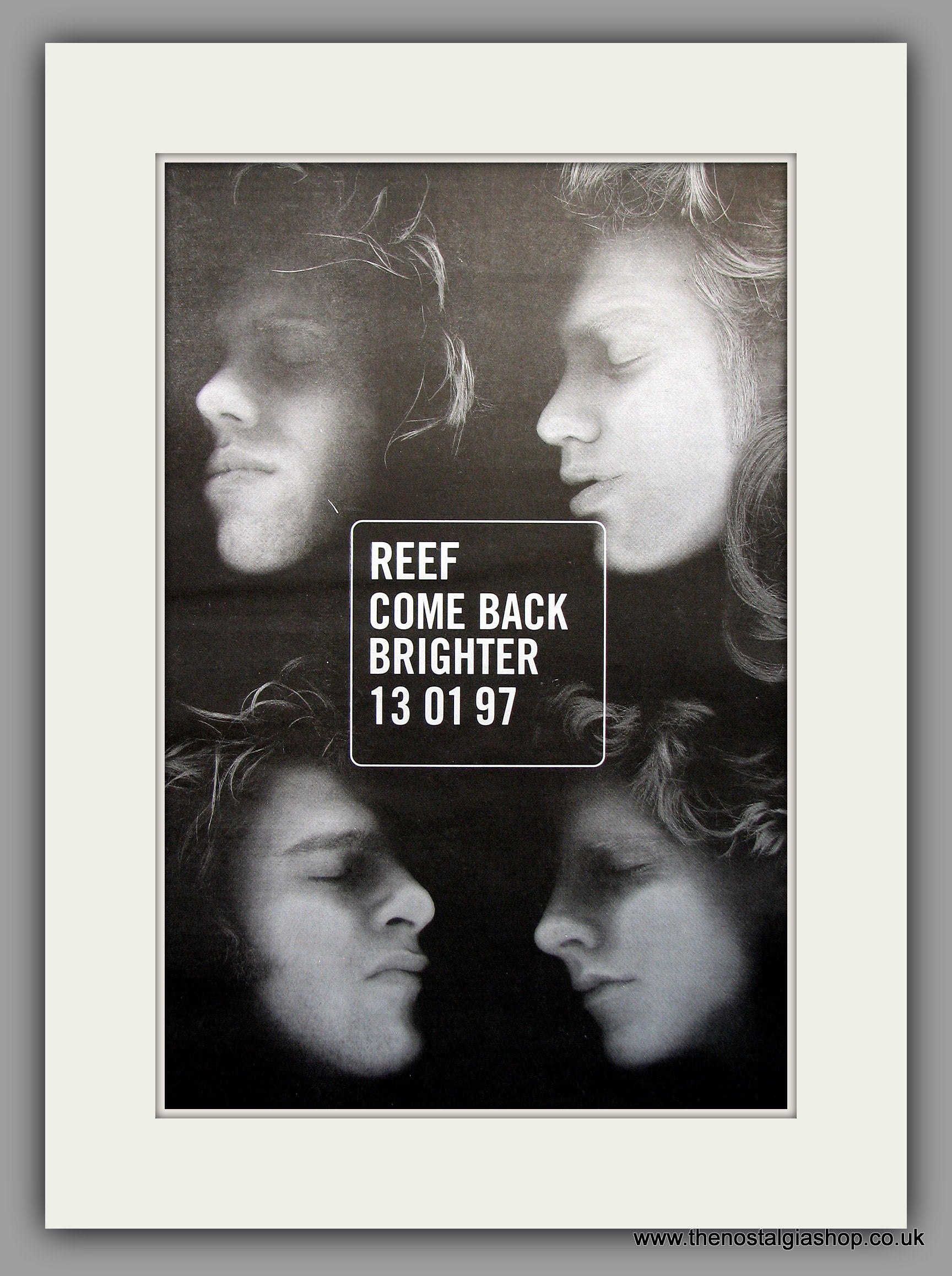 Reef - Come Back Brighter. Original Vintage Advert 1997 (ref AD11015). Presented and supplied in a cream bevel cut mount with backing card and clear bag. Ready to fit in a 20x16 inch frame. The mounted advert will be posted via courier and well packed - protected with a sheet of hardboard to keep it rigid. Any questions or enquiries, please get in touch, we are here to help! All our adverts, unless clearly stated are originals from the date shown. They make excellent pieces of wall art and stunning gifts. Many are rare and hard to find and once sold, may not be replaced. Remember you are buying a piece of history. Website watermark is not on original.