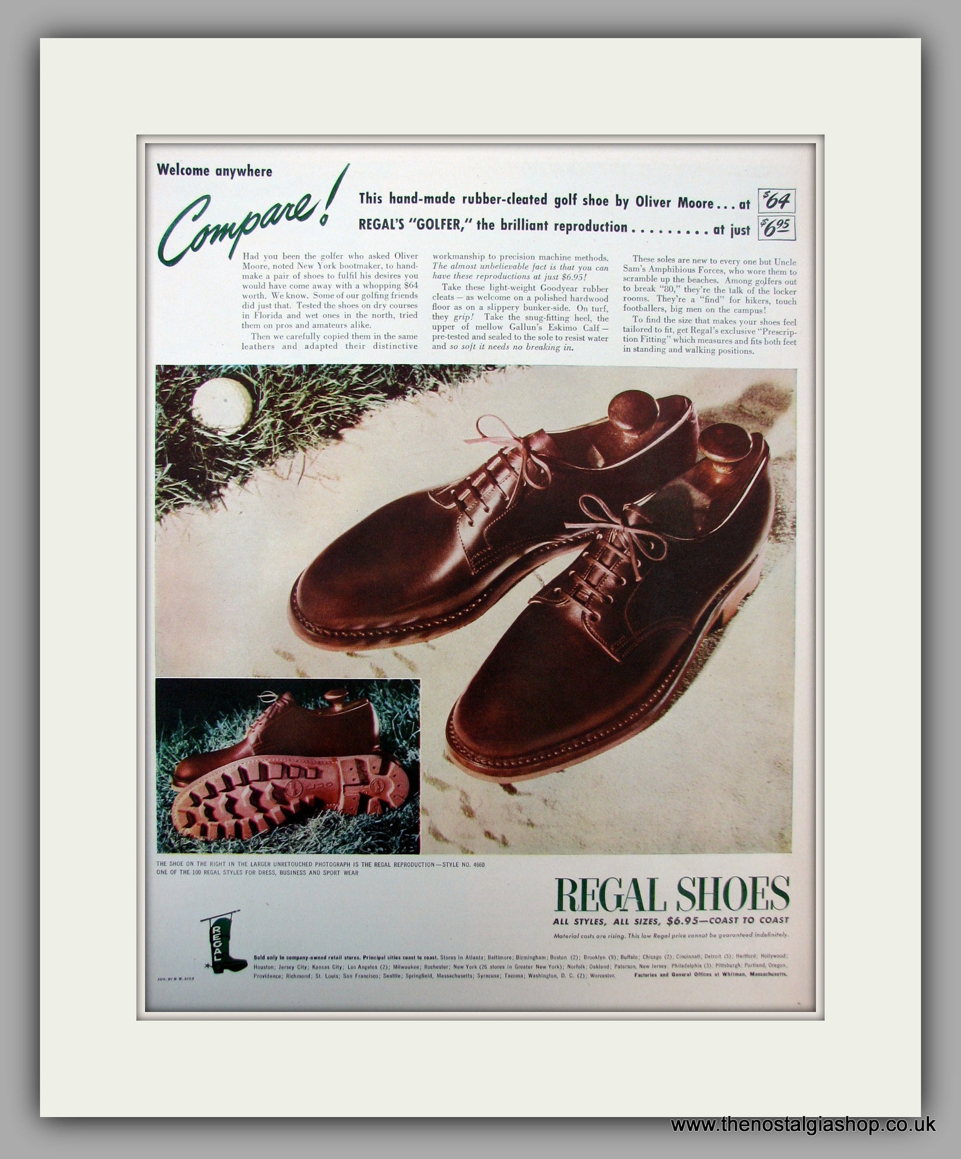Regal Shoes. Vintage Advert. Original advert from 1946. Presented in cream bevel cut mount with backing board and clear bag. Size of the Mount is 18 x 14 Inches. The perfect gift.- These adverts are all taken from Original publications of the dates stated. They are NOT modern reprints. Many are difficult to get hold of ,some are very rare and once sold may not be replaced, Remember, you are buying a piece of historic nostalgia. Lots more adverts available. Please contact us if you don't see the advert you want.