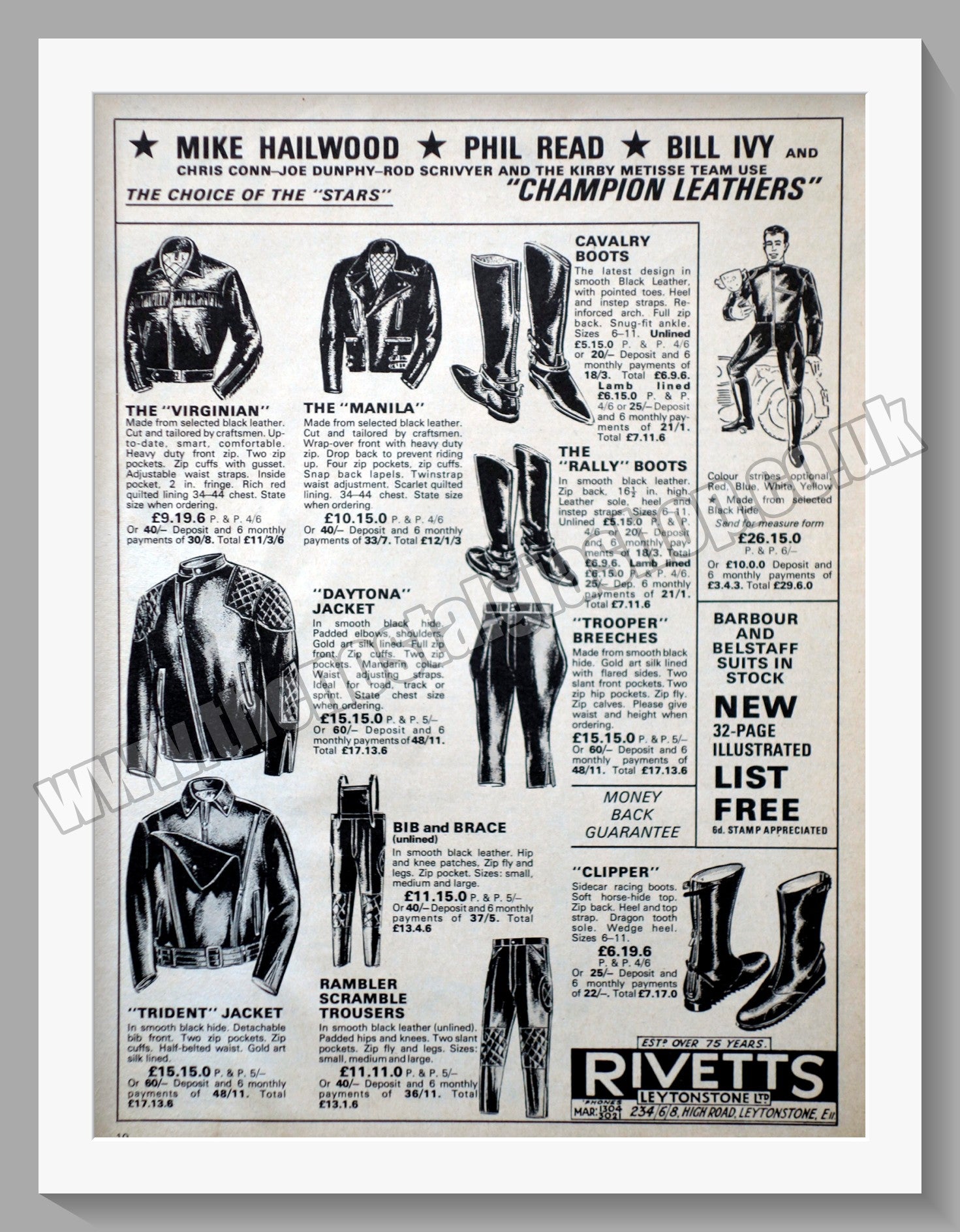 Rivetts Motor Cycle Clothing. Original Advert 1967. Presented and Supplied in 14 x 11 Inch, cream bevel cut mount with backing card and Clear bag. Ready to frame. All our adverts, unless clearly stated are Originals from the date shown They make excellent pieces of wall art and stunning gifts. Many are rare and hard to find and once sold, may not be replaced. Remember you are buying a piece of history. Website watermark is not on original. Vintage Motorcycle Clothing, Vintage Motorcycle Leathers.