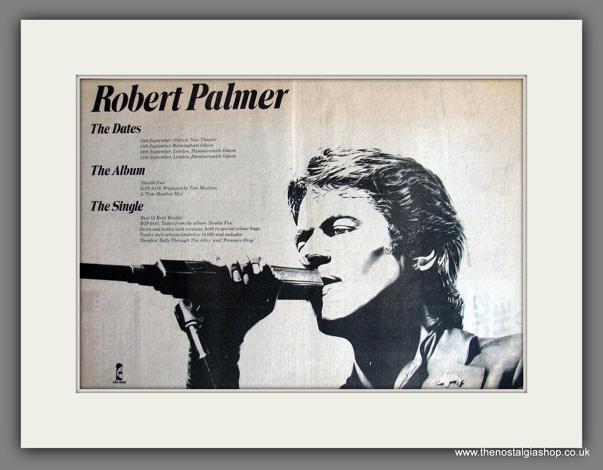 Robert Palmer. Double Fun, UK Tour. Vintage Advert. This is a large classic Original advert 1978. Presented and Supplied in a cream bevel cut mount with backing card and clear bag. Ready to fit in 20 x 16 inch frame. The mounted advert will be posted via courier and well packed - protected with a sheet of hardboard to keep it rigid. Any questions or inquiries, please get in touch, we are here to help! All our adverts, unless clearly stated are Originals from the date shown. They make excellent pieces of wall art and stunning gifts. Many are rare and hard to find and once sold, may not be replaced. Remember you are buying a piece of history. Website watermark is not on original.