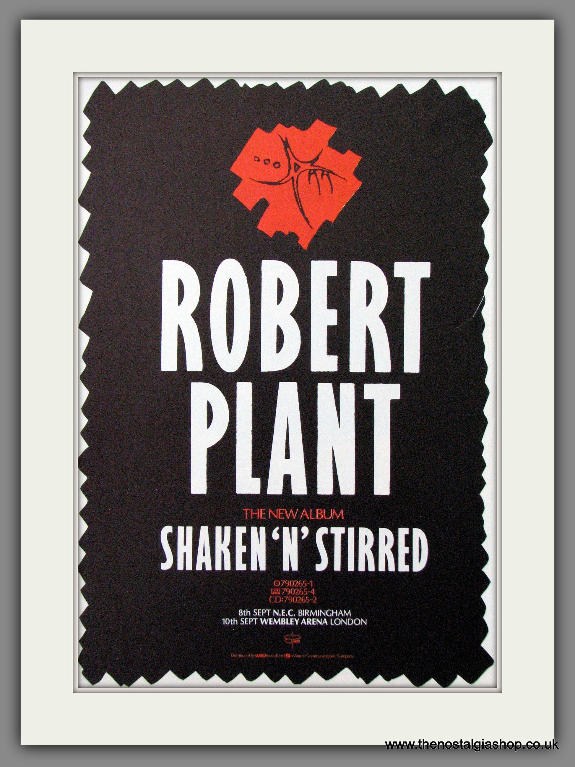 Robert Plant, Shaken 'N' Stirred. Large Original advert 1985. Presented and Supplied in a cream bevel cut mount with backing card and clear bag. Ready to fit in 20 x 16 inch frame. All our adverts, unless clearly stated are Originals from the date shown. They make excellent pieces of wall art and stunning gifts. Many are rare and hard to find and once sold, may not be replaced. Remember you are buying a piece of history. Website watermark is not on original. Led Zeppelin.