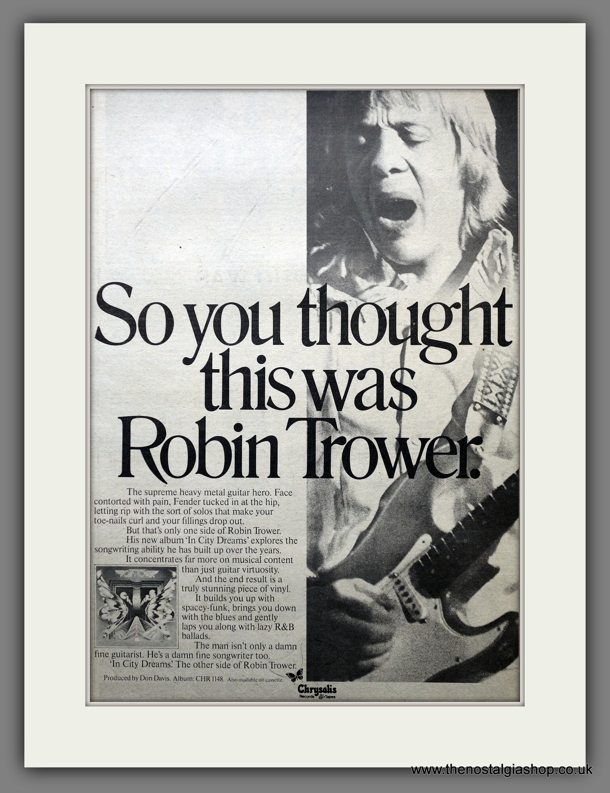 Robin Trower In City Dreams. This is a large classic Original Vintage Advert 1977. Presented and Supplied in a cream, bevel cut mount with backing card and clear bag. Ready to fit in 20 x 16 inch frame. The mounted advert will be posted via courier and well packed - protected with a sheet of hardboard to keep it rigid. Any questions or inquiries, please get in touch, we are here to help! All our adverts, unless clearly stated are Originals from the date shown. They make excellent pieces of wall art and stunning gifts. Many are rare and hard to find and once sold, may not be replaced. Remember you are buying a piece of history. Website watermark is not on original.