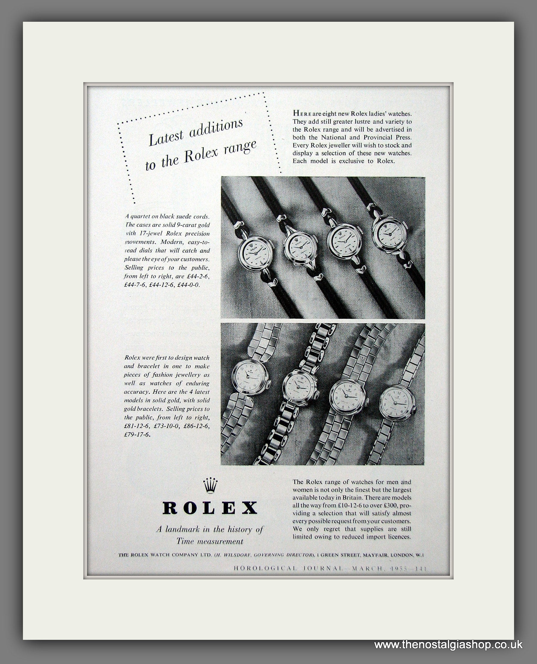 Rolex Ladies Watches. Classic Original Advert 1955. Presented and supplied in a cream bevel cut mount with backing card and clear bag. Ready to fit in 14 x 11 inch frame. Want it framing? If so, buy this then go to Frames Available Category. Click to buy on the suitable frame and we will do the rest. All our adverts, unless clearly stated are Originals from the date shown. They make excellent pieces of wall art and stunning gifts. Many are rare and hard to find and once sold, may not be replaced. Remember you are buying a piece of history. Website watermark is not on original.