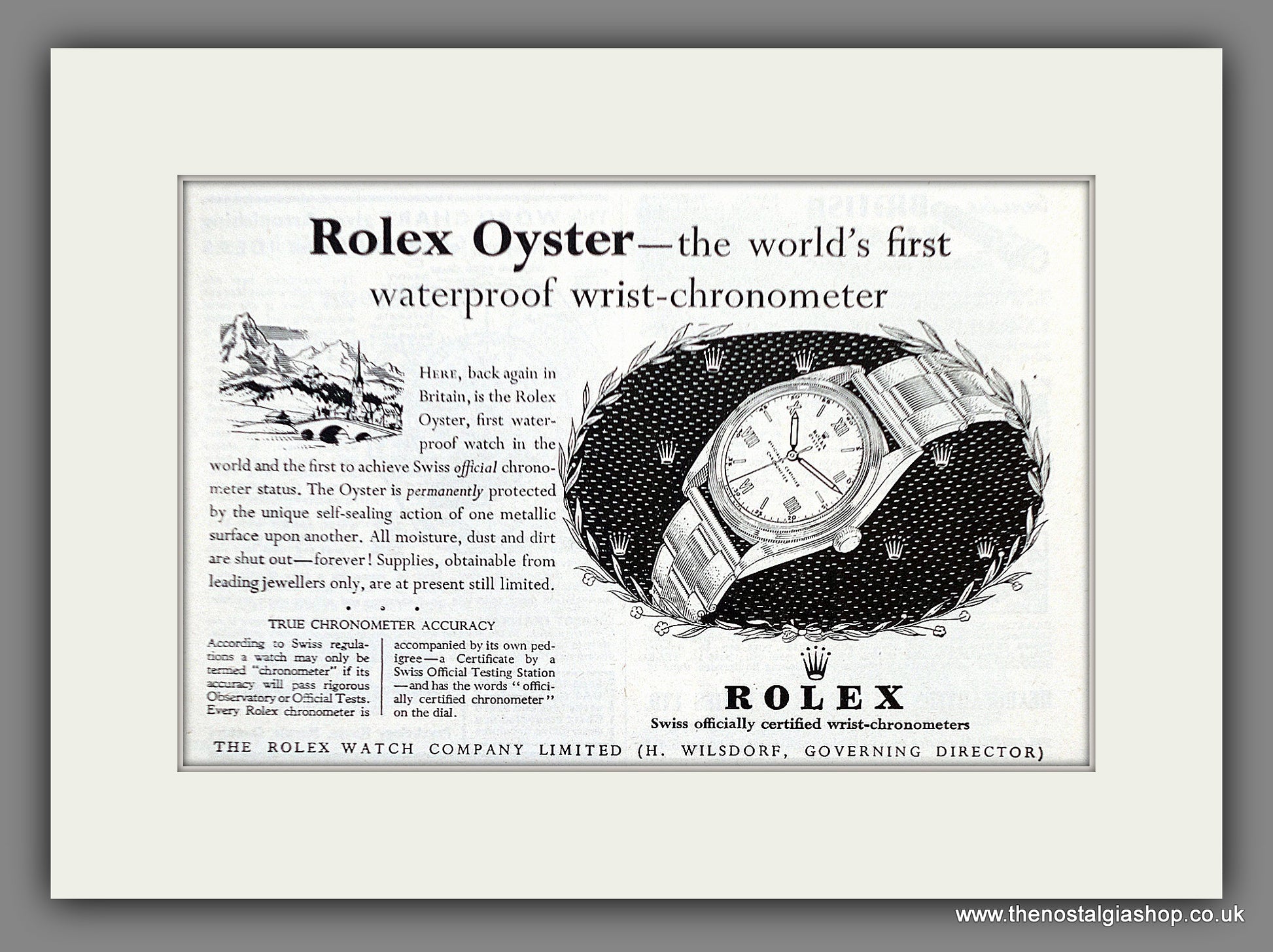Rolex Oyster. Vintage Advert. Original Vintage Advert 1948. Presented and Supplied in a cream bevel cut mount with backing card and clear bag. Ready to fit in 10 x 8 inch frame. All our adverts, unless clearly stated are Originals from the date shown. They make excellent pieces of wall art and stunning gifts. Many are rare and hard to find and once sold, may not be replaced. Remember you are buying a piece of history. Website watermark is not on original.