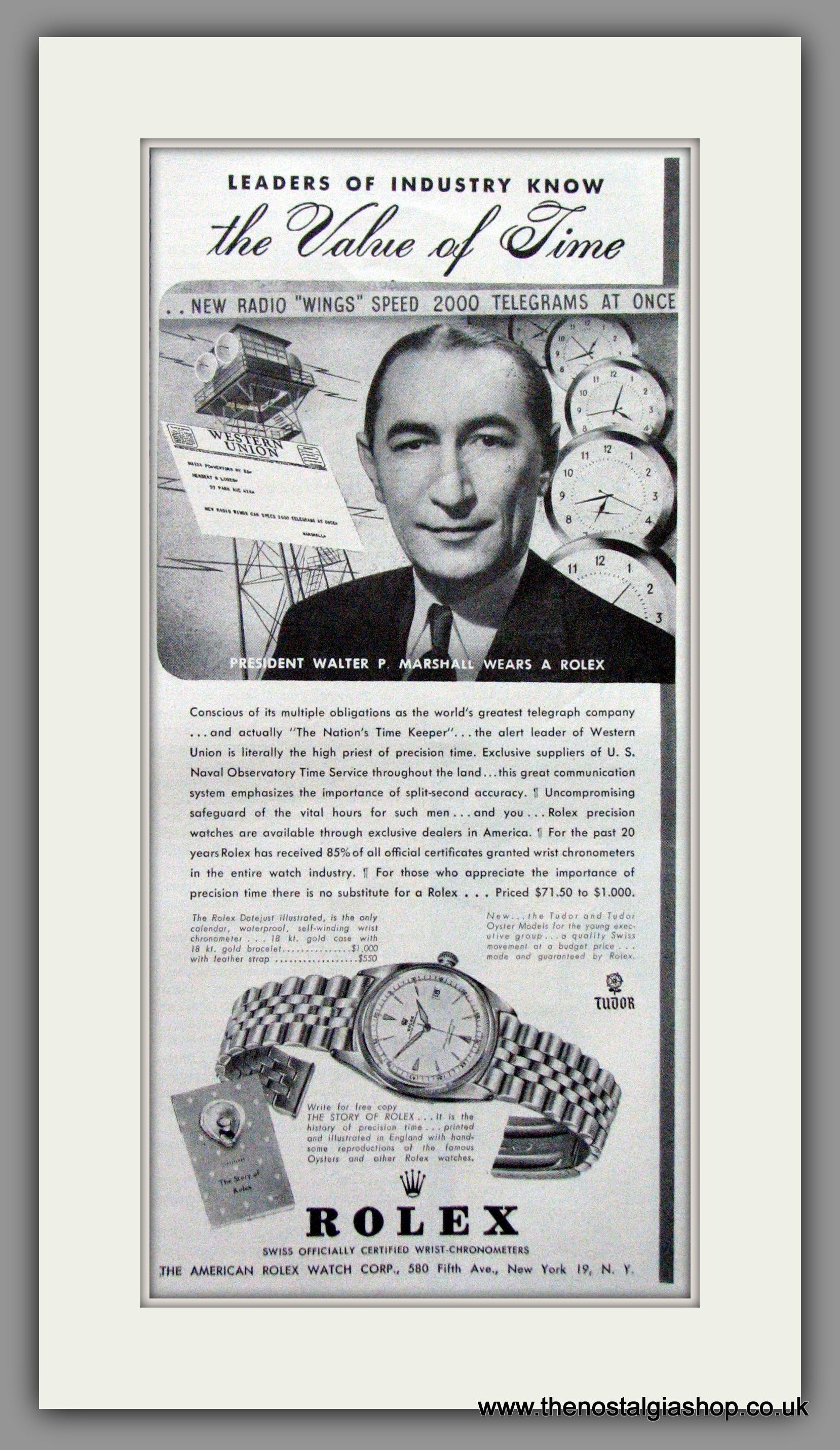 Rolex Leaders of Industry know...The Value of Time worn by President Thomas J. Deegan, - Railways, President Walter P. Marshall - Western Union and President Mundy I. Peale- U.S.A.F. Vintage Adverts. Classic original American adverts, all from 1949. Each is presented in cream bevel cut mount with backing card and clear bag. Ready to fit in 14 x 11 inch frames. Want them framing? If so, buy this then go to Frames Available Category. Click to buy on the suitable frames and we will do the rest. All our adverts, unless clearly stated are Originals from the date shown. They make excellent pieces of wall art and stunning gifts. Many are rare and hard to find and once sold, may not be replaced. Remember you are buying a piece of history. Website watermark is not on original.