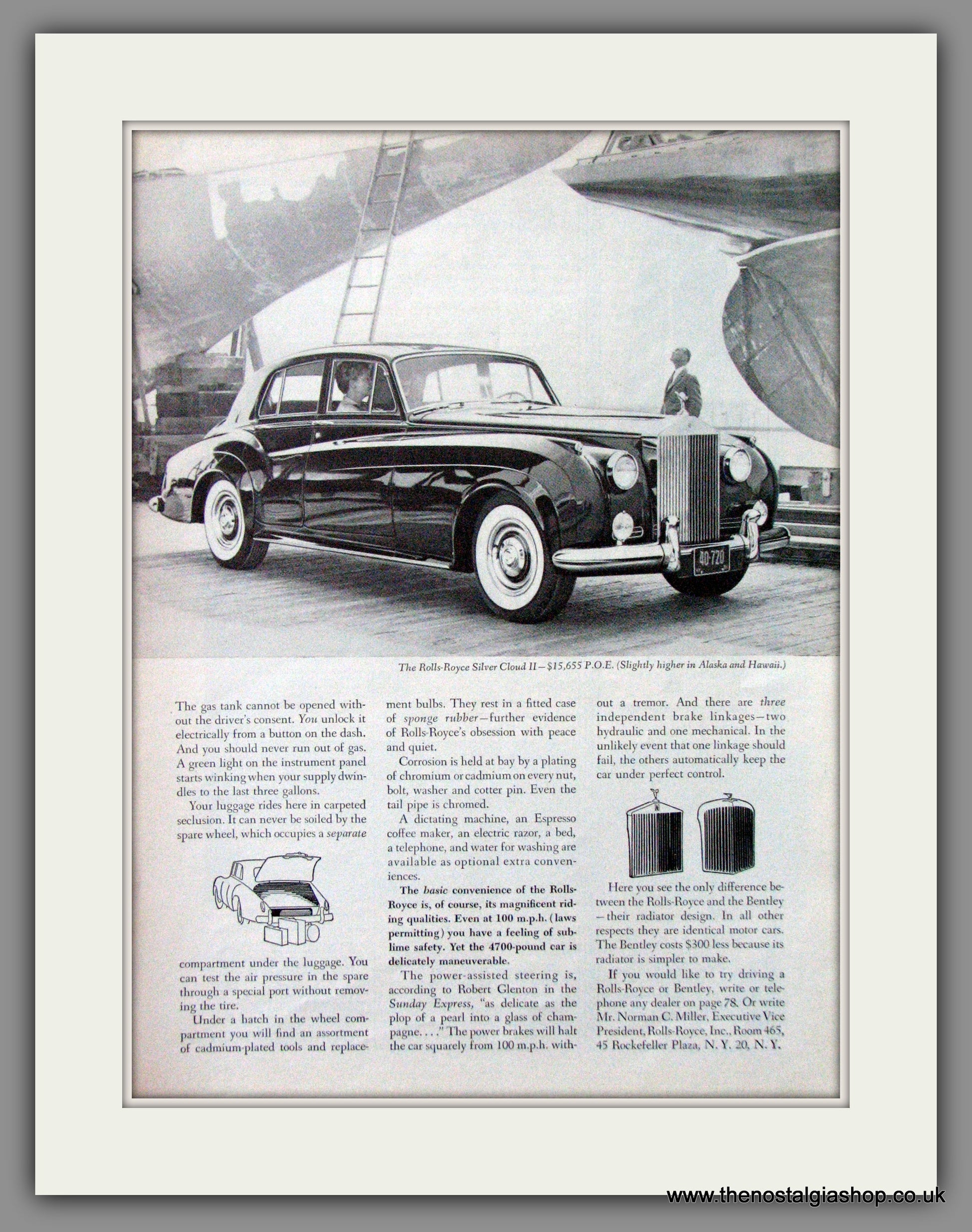 Rolls Royce Silver Cloud. Vintage Advert. Classic Original American advert 1962. Presented and Supplied in cream bevel cut mount, size 14 x 11 inches with backing card and clear bag. Ready to frame. Want it framing? If so, buy this then go to Frames Available Category. Click to buy on the suitable frame and we will do the rest. All our adverts, unless clearly stated are Originals from the date shown They make excellent pieces of wall art and stunning gifts. Many are rare and hard to find and once sold, may not be replaced. Remember you are buying a piece of history. Website watermark is not on original.