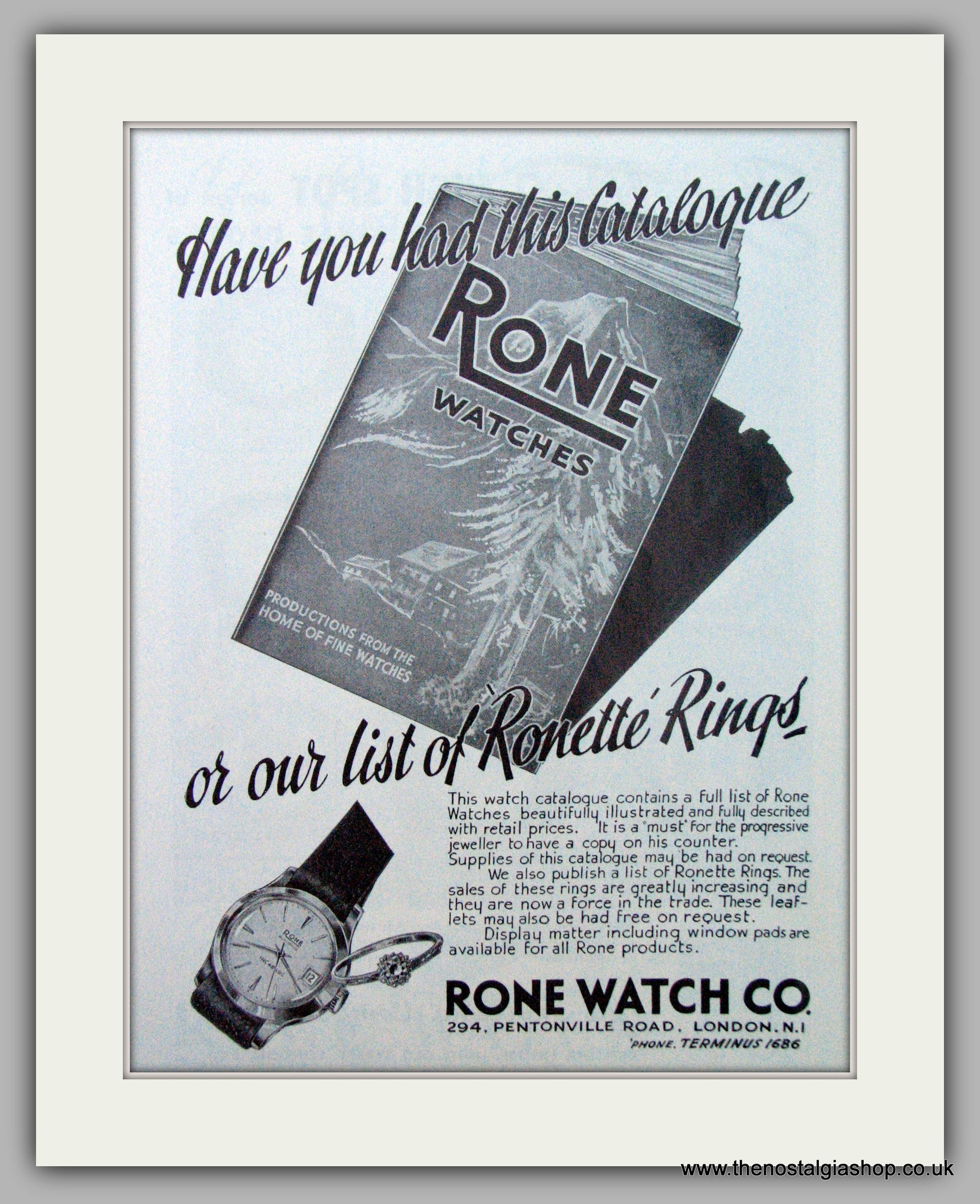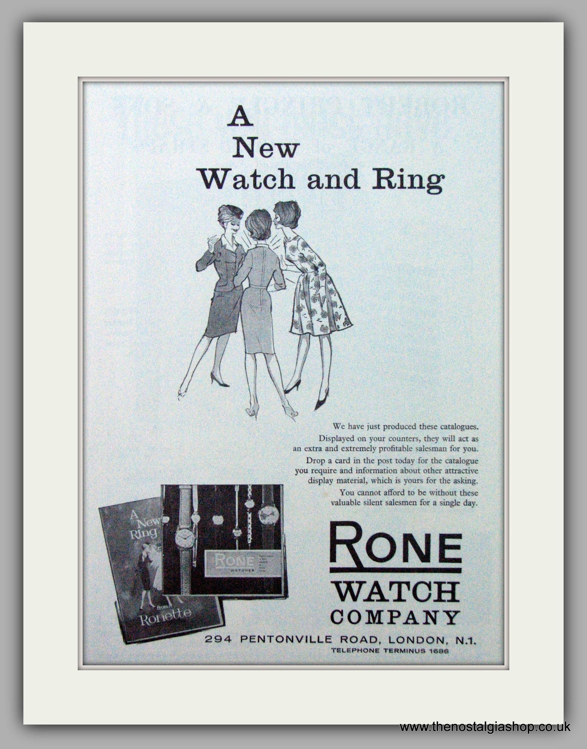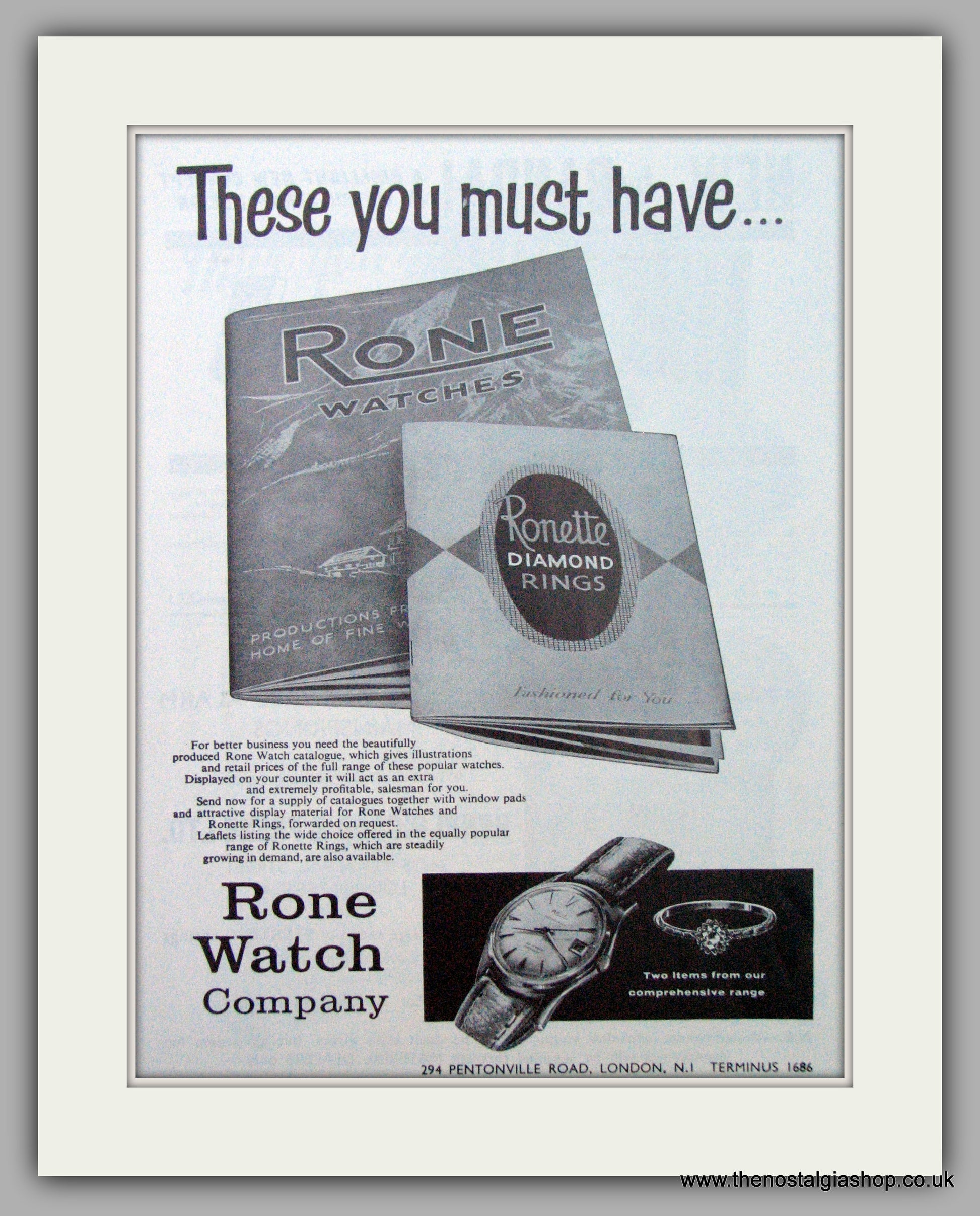 Rone Watches. Have you had this catalogue . Vintage Adverts. Original Adverts 1961/62/63. Price is for 3 adverts. Presented in cream bevel cut mount with backing card and clear bag. Each is ready to fit in 14 x 11 inch frames. Want them framing? If so, buy this then go to Frames Available Category. Click to buy on the suitable frame(s) and we will do the rest. All our adverts, unless clearly stated are Originals from the date shown. They make excellent pieces of wall art and stunning gifts. Many are rare and hard to find and once sold, may not be replaced. Remember you are buying a piece of history. Website watermark is not on original.