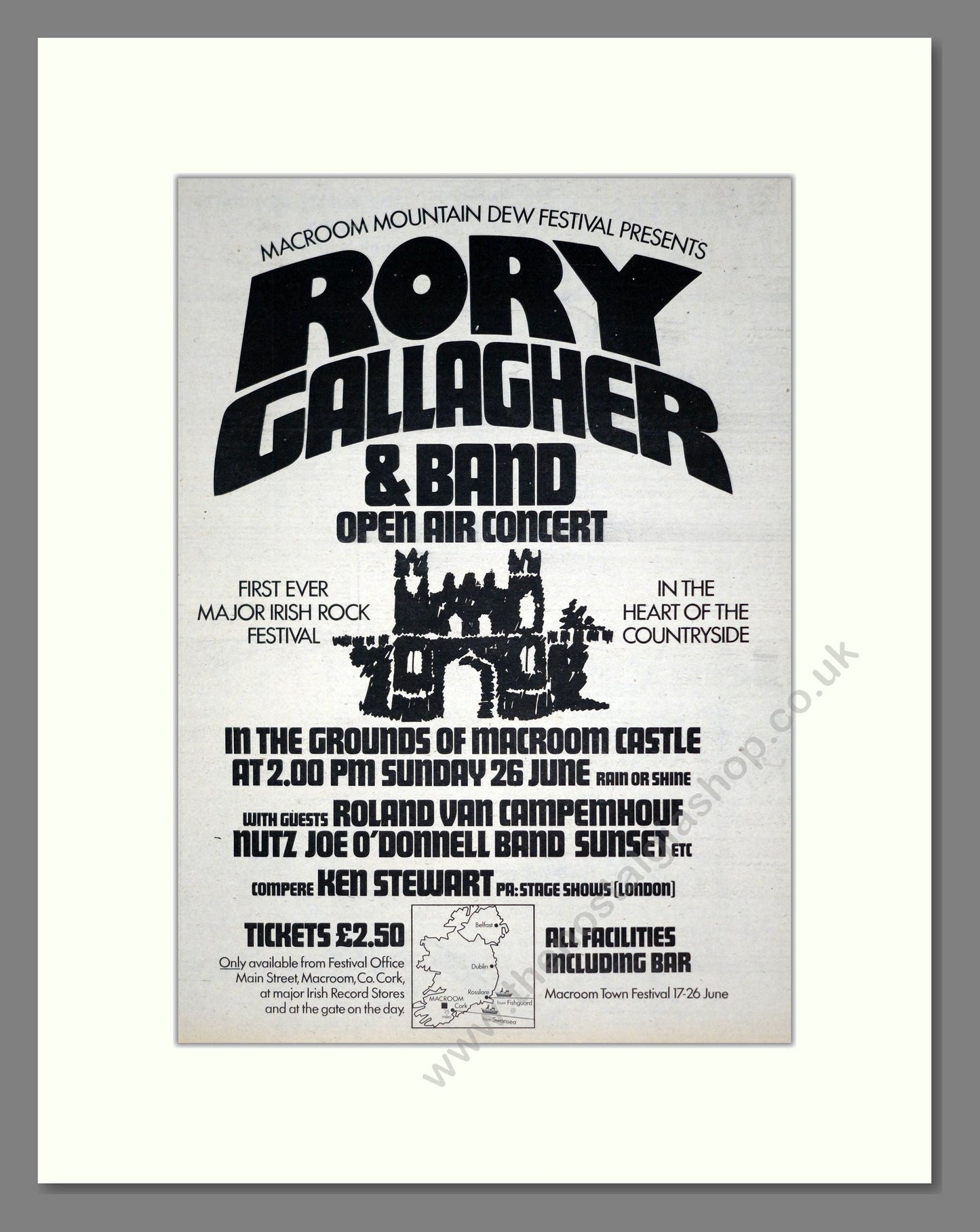 Rory Gallagher - Macroom Castle. Vintage Advert. This is a large classic original advert from 1977. Presented and supplied in a cream bevel cut mount with backing card and clear bag. Ready to fit in a 20 x 16 inches frame. The mounted advert will be posted via courier and well packed - protected with a sheet of hardboard to keep it rigid. Any questions or enquiries, please get in touch, we are here to help! All our adverts, unless clearly stated are originals from the date shown. They make excellent pieces of wall art and stunning gifts. Many are rare and hard to find and once sold, may not be replaced. Remember you are buying a piece of history. Website watermark is not on original.