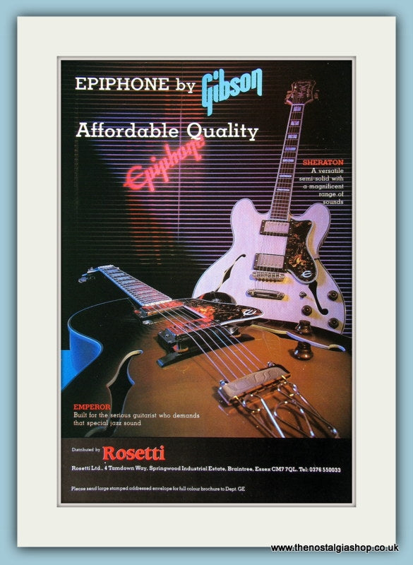 Rosetti Guitar Distributers. Epiphone by Gibson also Shearaton, Emperor . Classic original advert 1990. Professionally sealed and presented in cream bevel cut mount with backing card. Ready to fit in 14 x 11 inch frame. Want it framing? If so, buy this then go to Frames Available Catagory. Click to buy on the suitable frame and we will do the rest. All our adverts, unless clearly stated are Originals from the date shown. They make excellent pieces of wall art and stunning gifts. Many are rare and hard to find and once sold, may not be replaced. Remember you are buying a piece of history. Website watermark is not on original.