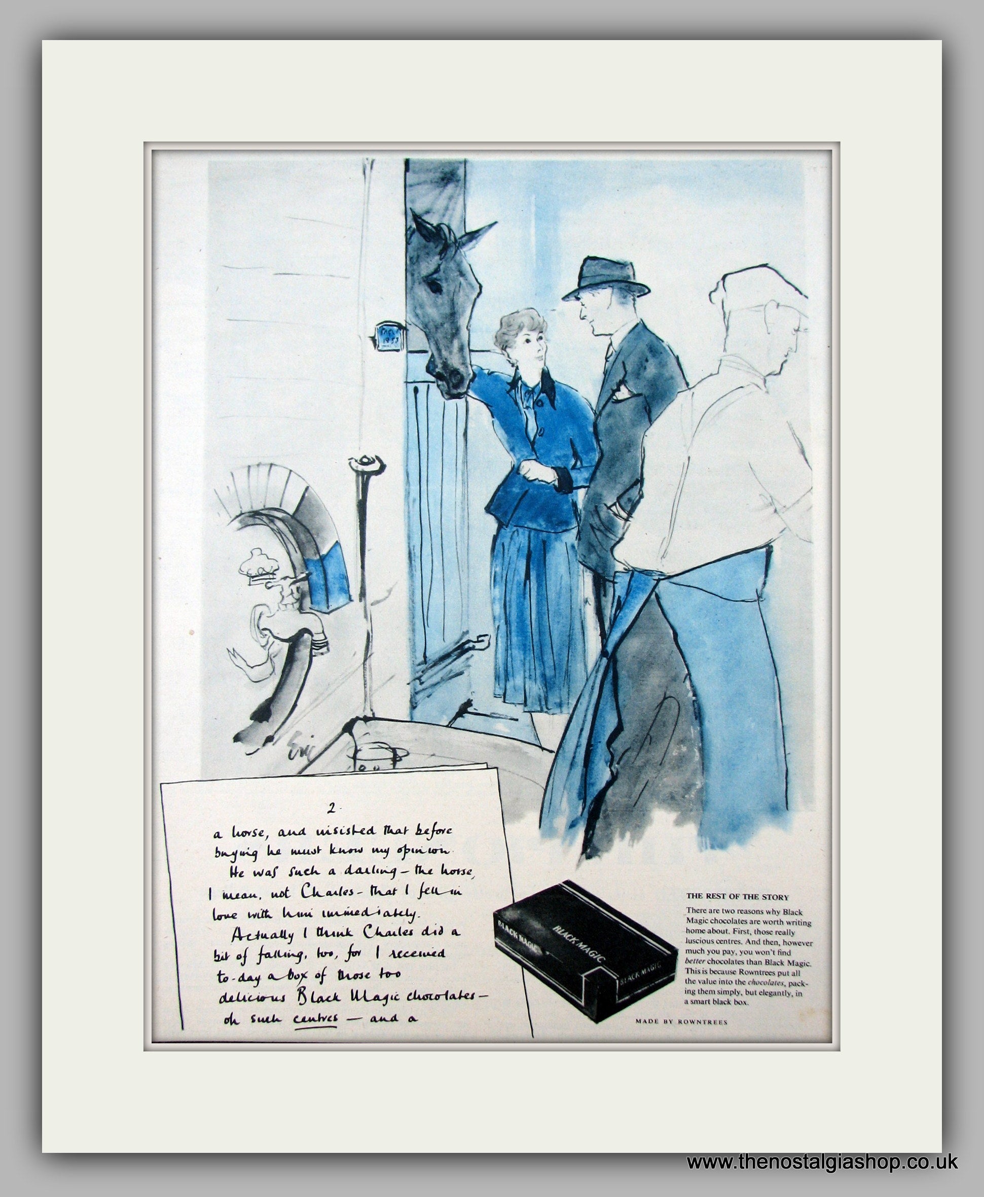Rowntrees Black Magic. Original Advert 1954 (ref AD9969). Presented and supplied in a cream bevel cut mount with backing card and clear bag. Ready to fit in a 18 x 14 inch frame. The mounted advert will be posted via courier and well packed - protected with a sheet of hardboard to keep it rigid. Any questions or enquiries, please get in touch, we are here to help! All our adverts, unless clearly stated are originals from the date shown. They make excellent pieces of wall art and stunning gifts. Many are rare and hard to find and once sold, may not be replaced. Remember you are buying a piece of history. Website watermark is not on original.