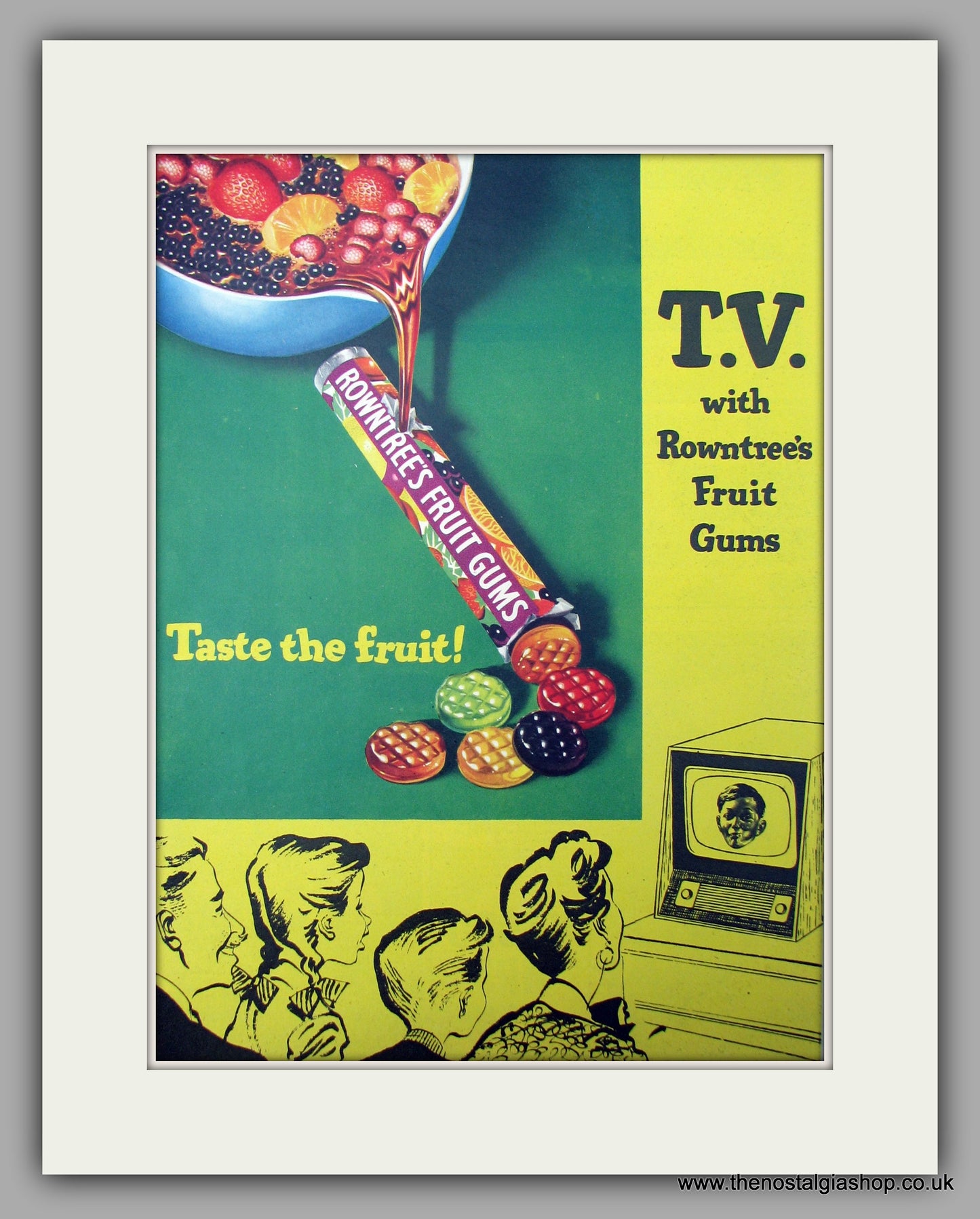 Rowntrees Fruit Gums. Original Advert 1954 (ref AD10012). Presented and supplied in a cream bevel cut mount with backing card and clear bag. Ready to fit in a 18 x 14 inch frame. The mounted advert will be posted via courier and well packed - protected with a sheet of hardboard to keep it rigid. Any questions or enquiries, please get in touch, we are here to help! All our adverts, unless clearly stated are originals from the date shown. They make excellent pieces of wall art and stunning gifts. Many are rare and hard to find and once sold, may not be replaced. Remember you are buying a piece of history. Website watermark is not on original.