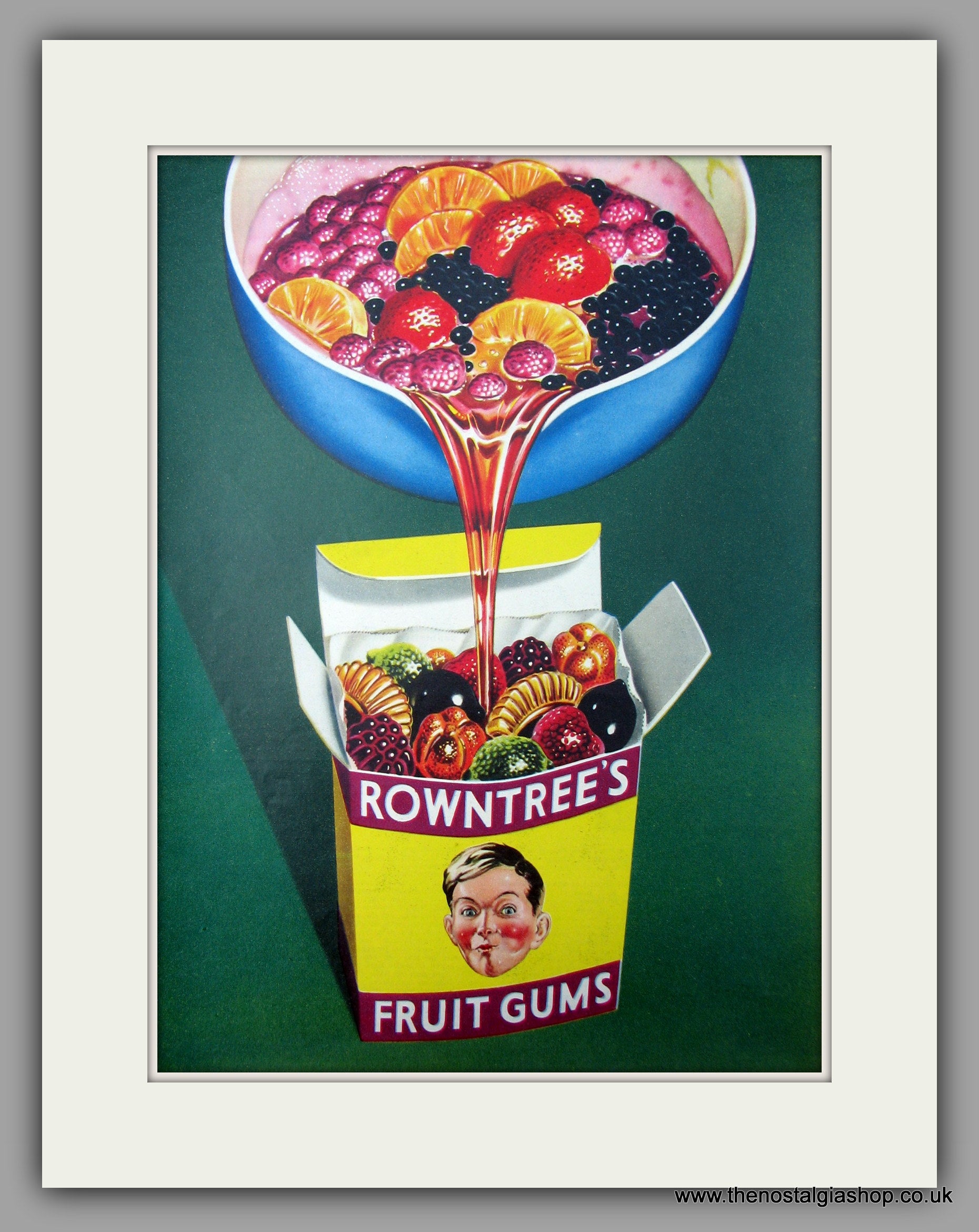Rowntrees Fruit Gums. Original Advert 1956 (ref AD10014). Presented and supplied in a cream bevel cut mount with backing card and clear bag. Ready to fit in a 18 x 14 inch frame. The mounted advert will be posted via courier and well packed - protected with a sheet of hardboard to keep it rigid. Any questions or enquiries, please get in touch, we are here to help! All our adverts, unless clearly stated are originals from the date shown. They make excellent pieces of wall art and stunning gifts. Many are rare and hard to find and once sold, may not be replaced. Remember you are buying a piece of history. Website watermark is not on original.