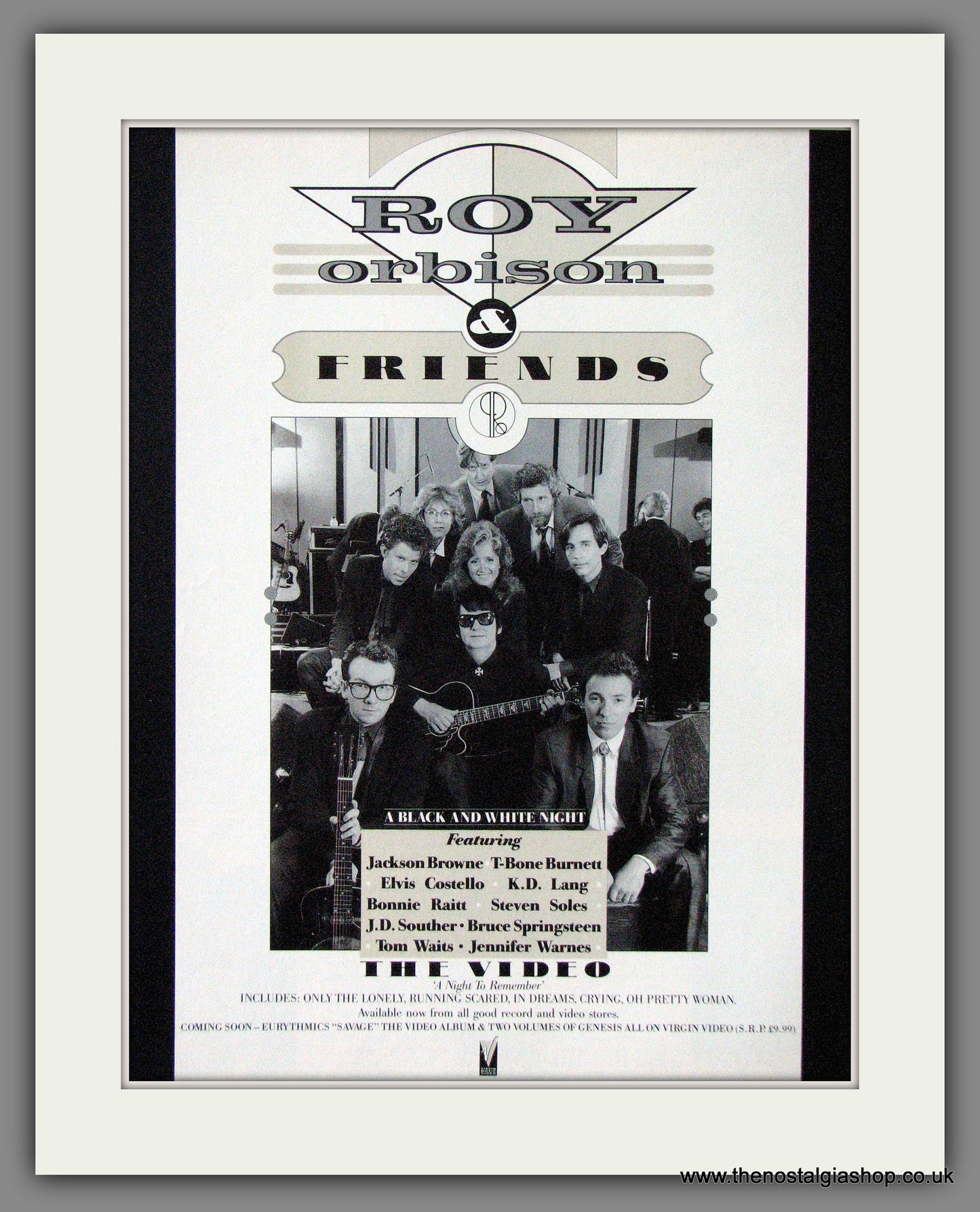 Roy Orbison And Friends. A Black And White Night. Classic Original advert 1988. Presented and Supplied in a cream bevel cut mount with backing card and clear bag. Ready to fit in 14 x 11 inch frame. Want it framing? If so, buy this then go to Frames Available Category. Click to buy on the suitable frame and we will do the rest. All our adverts, unless clearly stated are Originals from the date shown. They make excellent pieces of wall art and stunning gifts. Many are rare and hard to find and once sold, may not be replaced. Remember you are buying a piece of history. Website watermark is not on original.