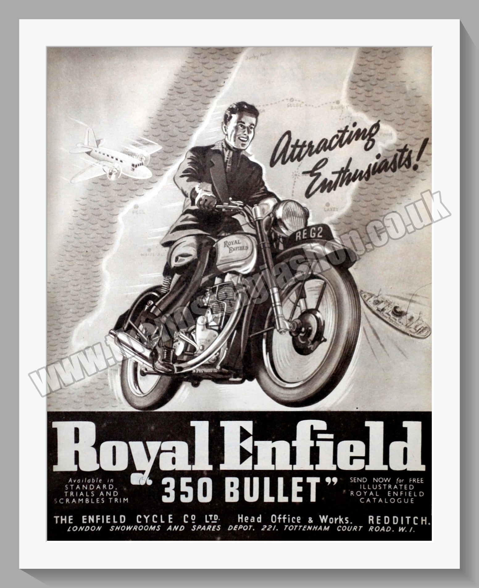 Royal Enfield 350 Bullet Motor Cycle. Original Vintage Advert from 1950. Presented and Supplied in a 14 x 11 Inch, cream bevel cut mount with backing board and Clear Bag. Ready to frame. The perfect gift.- These adverts are all Originals of the dates stated. They are NOT modern reprints. Many are difficult to get hold of , some are very rare and once sold may not be replaced, Remember, you are buying a piece of historic nostalgia. Website Watermark is not on the product. Vintage Motorcycle Advertising. The Royal Enfield Cycle Co. Ltd.