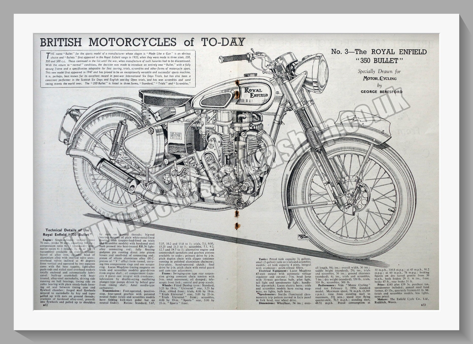 Royal Enfield 350 Bullet Motor Cycle. Double Original Vintage Advert from 1951. Presented and Supplied in a 20 x 16 Inch, cream bevel cut mount with backing board and Clear Bag. Ready to frame. The perfect gift.- These adverts are all Originals of the dates stated. They are NOT modern reprints. Many are difficult to get hold of , some are very rare and once sold may not be replaced, Remember, you are buying a piece of historic nostalgia. Website Watermark is not on the product. Vintage Motorcycle Advertising. The Royal Enfield Cycle Co. Ltd.