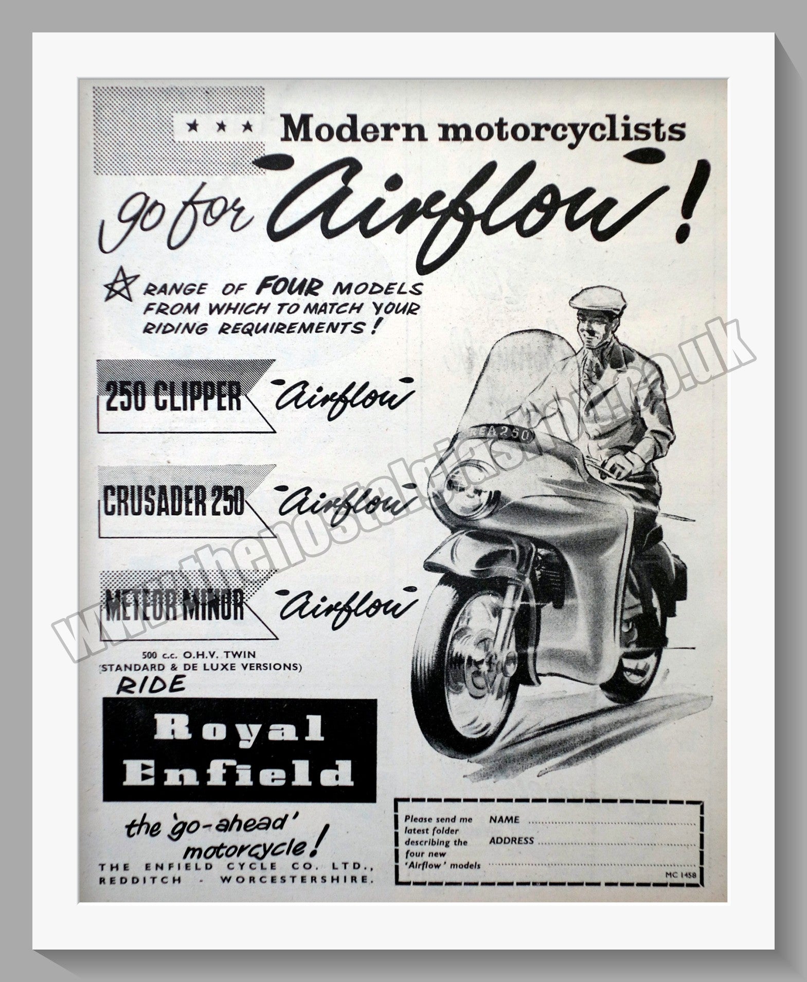 Royal Enfield Airflow Motor Cycle. Original Vintage Advert from 1958. Presented and Supplied in a 14 x 11 Inch, cream bevel cut mount with backing board and Clear Bag. Ready to frame. The perfect gift.- These adverts are all Originals of the dates stated. They are NOT modern reprints. Many are difficult to get hold of , some are very rare and once sold may not be replaced, Remember, you are buying a piece of historic nostalgia. Website Watermark is not on the product. Vintage Motorcycle Advertising. The Royal Enfield Cycle Co. Ltd.