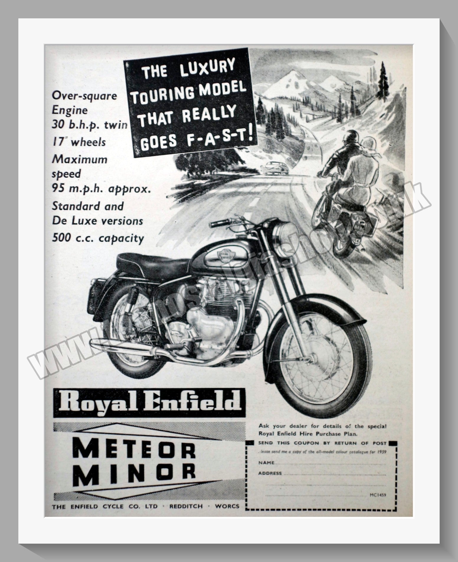 Royal Enfield Meteor Minor 500cc Motor Cycle. Original Vintage Advert from 1959. Presented and Supplied in a 14 x 11 Inch, cream bevel cut mount with backing board and Clear Bag. Ready to frame. The perfect gift.- These adverts are all Originals of the dates stated. They are NOT modern reprints. Many are difficult to get hold of , some are very rare and once sold may not be replaced, Remember, you are buying a piece of historic nostalgia. Website Watermark is not on the product. Vintage Motorcycle Advertising. The Enfield Cycle Co. Ltd.