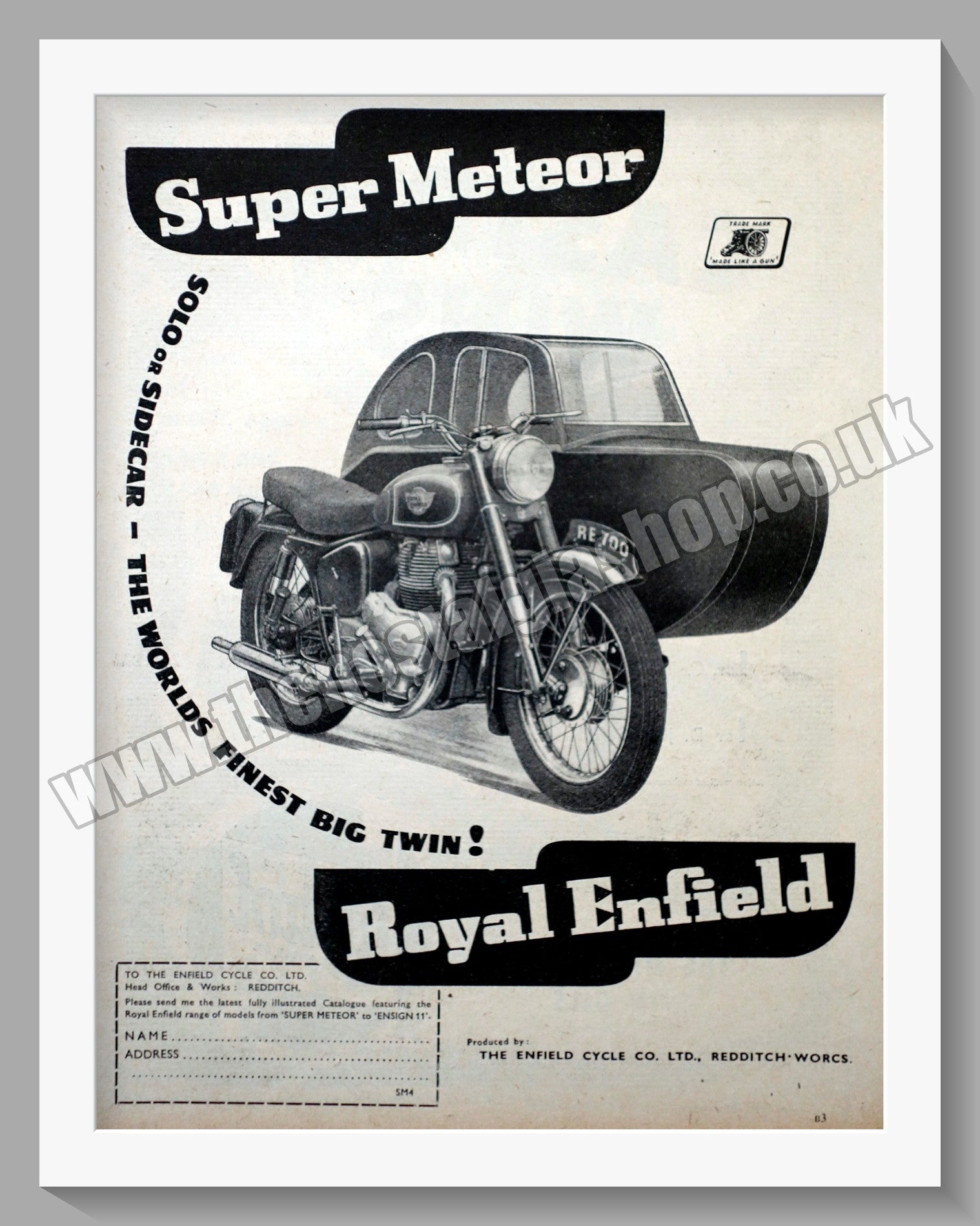 Royal Enfield Super Meteor Motor Cycle. Original Vintage Advert from 1956. Presented and Supplied in a 14 x 11 Inch, cream bevel cut mount with backing board and Clear Bag. Ready to frame. The perfect gift.- These adverts are all Originals of the dates stated. They are NOT modern reprints. Many are difficult to get hold of , some are very rare and once sold may not be replaced, Remember, you are buying a piece of historic nostalgia. Website Watermark is not on the product. Vintage Motorcycle Advertising. The Enfield Cycle Co. Ltd.