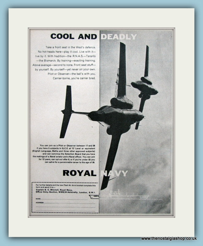 Royal Navy. Cool and Deadly. Set of 2 Classic original adverts 1962 & 1965 (price is for both adverts). Each is presented in cream bevel cut mount with backing card and clear bag. Each is ready to fit in 14 x 11 inch frame. Want them framing? If so, buy this then go to Frames Available Category. Click to buy on the suitable frame(s) and we will do the rest. All our adverts, unless clearly stated are Originals from the date shown They make excellent pieces of wall art and stunning gifts. Many are rare and hard to find and once sold, may not be replaced. Remember you are buying a piece of history. Website watermark is not on original.