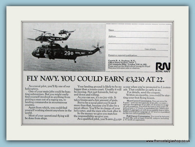 Royal Navy Helicopter. You could earn £3230 at 22. 2 x Classic original adverts 1971 & 1973. (price is for both adverts) Each is presented in cream bevel cut mount with backing card and clear bag. Each is ready to fit in 12 x 10 inch frame. Want them framing? If so, buy this then go to Frames Available Category. Click to buy on the suitable frame(s) and we will do the rest. All our adverts, unless clearly stated are Originals from the date shown They make excellent pieces of wall art and stunning gifts. Many are rare and hard to find and once sold, may not be replaced. Remember you are buying a piece of history. Website watermark is not on original.