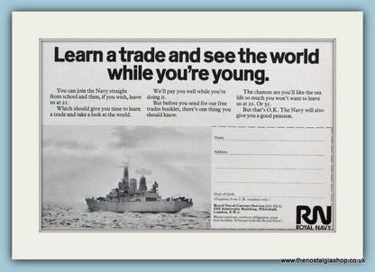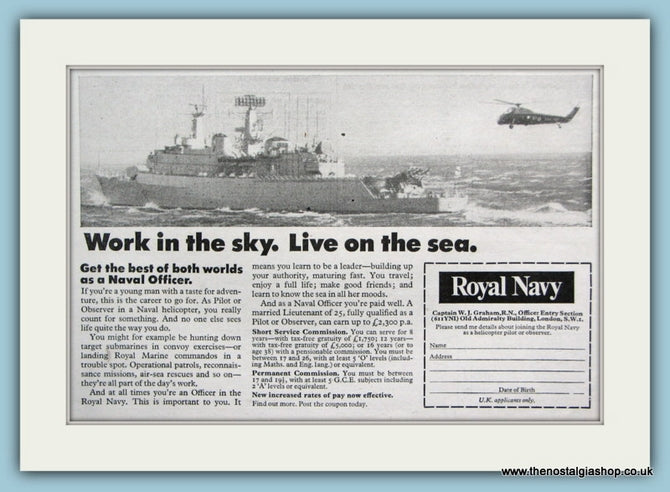 Royal Navy Learn a Trade. Work in the sky, live on the sea. 2 x Classic original adverts 1968. (price is for both adverts) Each is presented in cream bevel cut mount with backing card and clear bag. Each is ready to fit in 12 x 10 inch frame. Want them framing? If so, buy this then go to Frames Available Category. Click to buy on the suitable frame(s) and we will do the rest. All our adverts, unless clearly stated are Originals from the date shown They make excellent pieces of wall art and stunning gifts. Many are rare and hard to find and once sold, may not be replaced. Remember you are buying a piece of history. Website watermark is not on original.